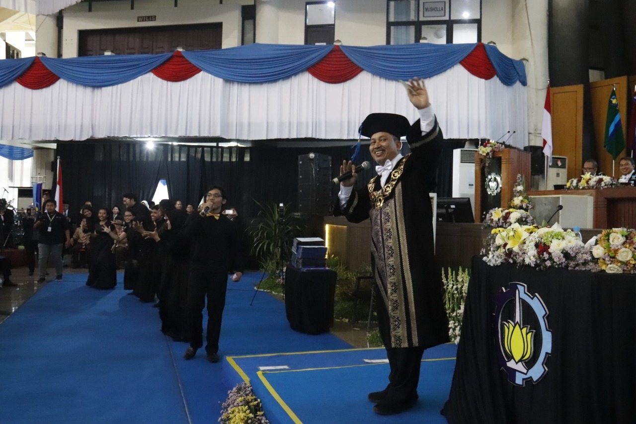 Kampus ITS, ITS News – Prosesi wisuda ke-119 Institut Teknologi Sepuluh Nopember (ITS), Sabtu – Minggu (16-17/3), telah berlangsung dengan sangat meriah dan berbeda dari sebelumnya. Tak hanya meriah, Rektor ITS Prof Ir Joni Hermana MScES PhD secara mengejutkan tampil menghibur para wisudawan beserta undangan dengan nyanyian yang mengandung banyak pesan.
