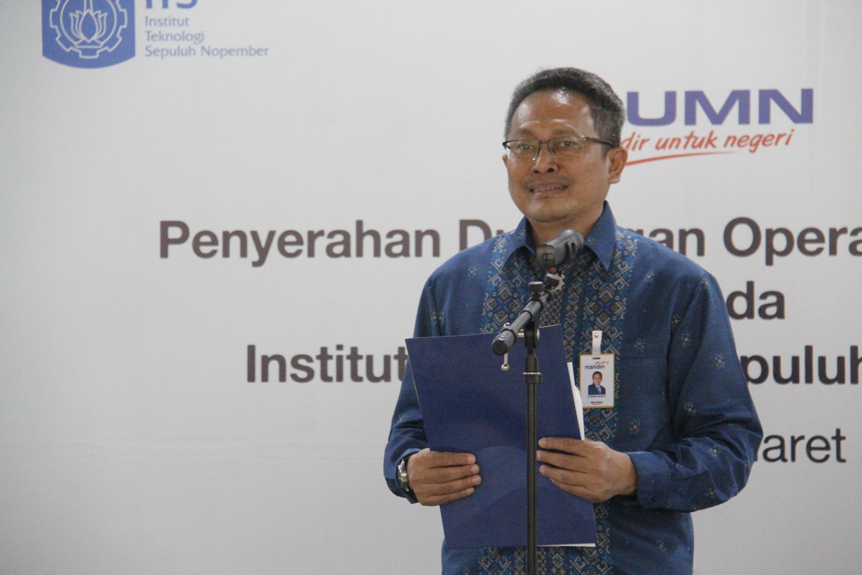Regional CEO-Region VIII/Jawa 3 Bank Mandiri, R Erwan Djoko Hermawan menyampaikan sepatah dua patah kata sebelum prosesi penyerahan bus dari Bank Mandiri kepada ITS