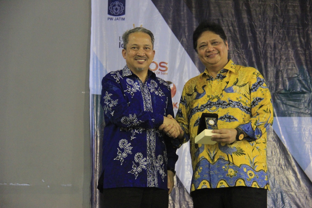 Rektor ITS Prof Joni Hermana (kiri) saat memberikan cinderamata kepada Menteri Perindustrian Republik Indonesia, Ir Airlangga Hartarto MBA MMT