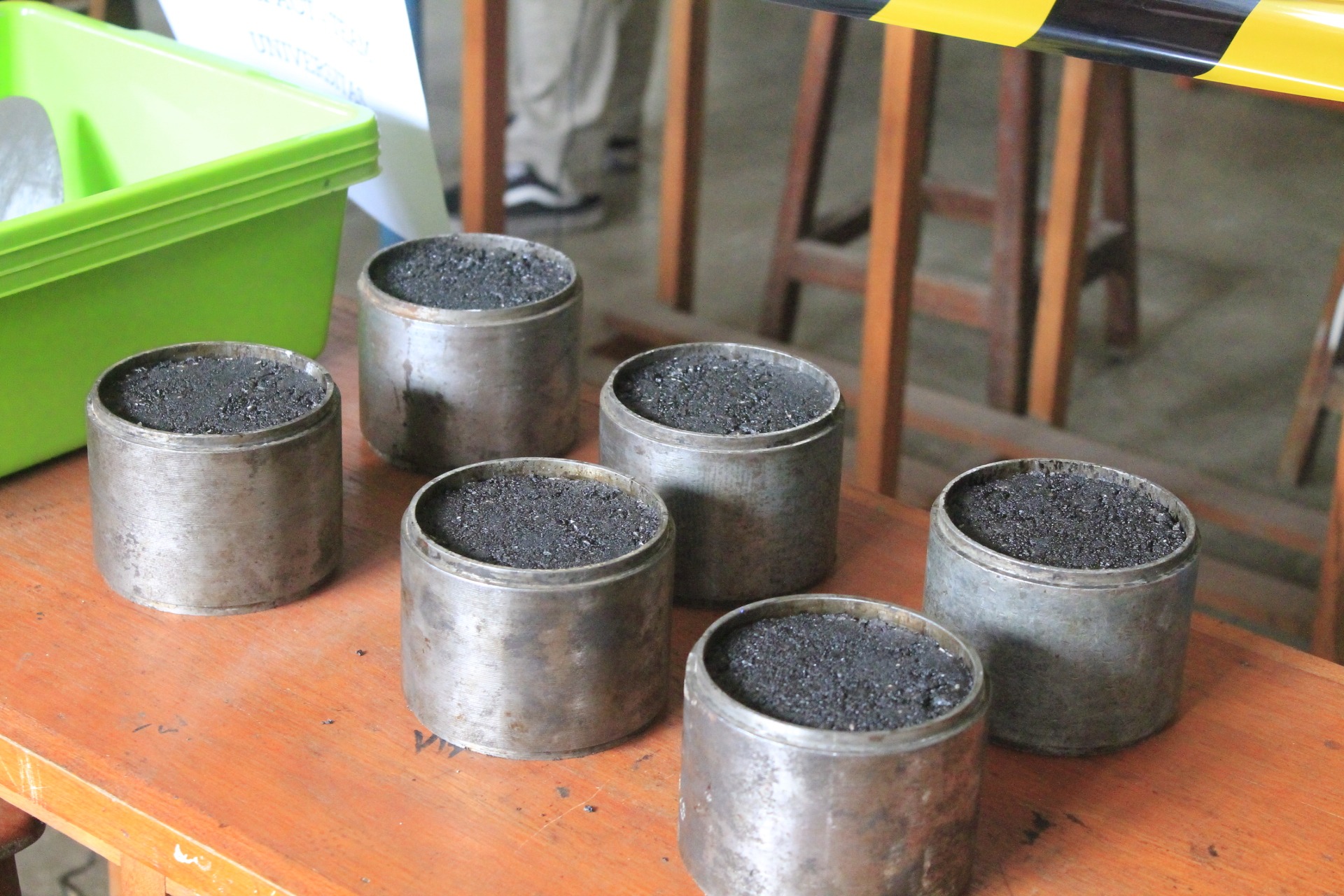 Enam sampel aspal beton yang sedang dalam proses pendinginan pada ruangan terbuka