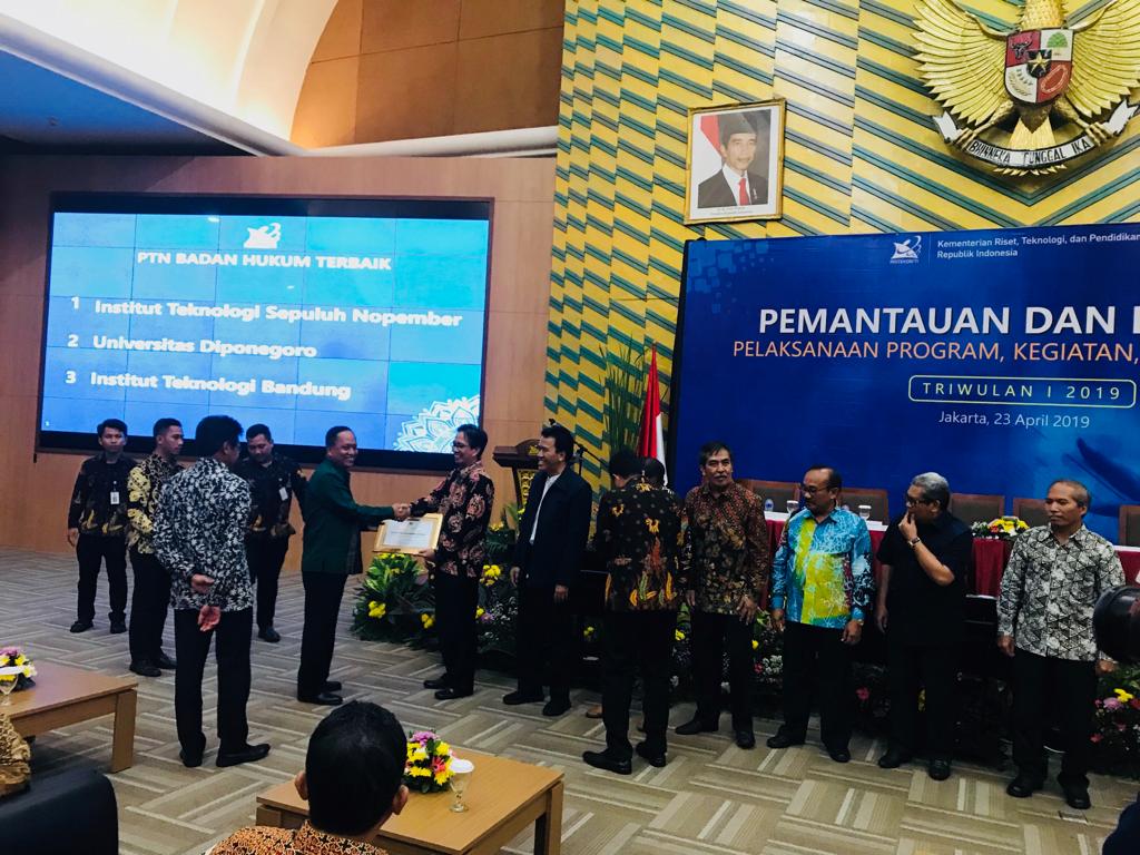 Kampus ITS, ITS News – Institut Teknologi Sepuluh Nopember (ITS) mengukir prestasi membanggakan dengan mendapatkan penghargaan sebagai terbaik pertama Perguruan Tinggi Negeri Badan Hukum (PTN-BH) dari Kementerian Riset, Teknologi dan Pendidikan Tinggi (Kemenristekdikti) RI. Penghargaan ini diberikan pada acara Pemantauan dan Evaluasi Pelaksanaan Program, Kegiatan, dan Anggaran Triwulan I 2019 di Jakarta, Selasa (23/4).