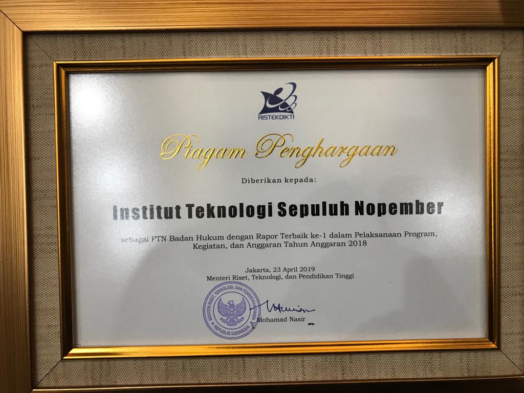 Piagam Penghargaan ITS sebagai PTN-BH dengan Rapor Terbaik ke-1