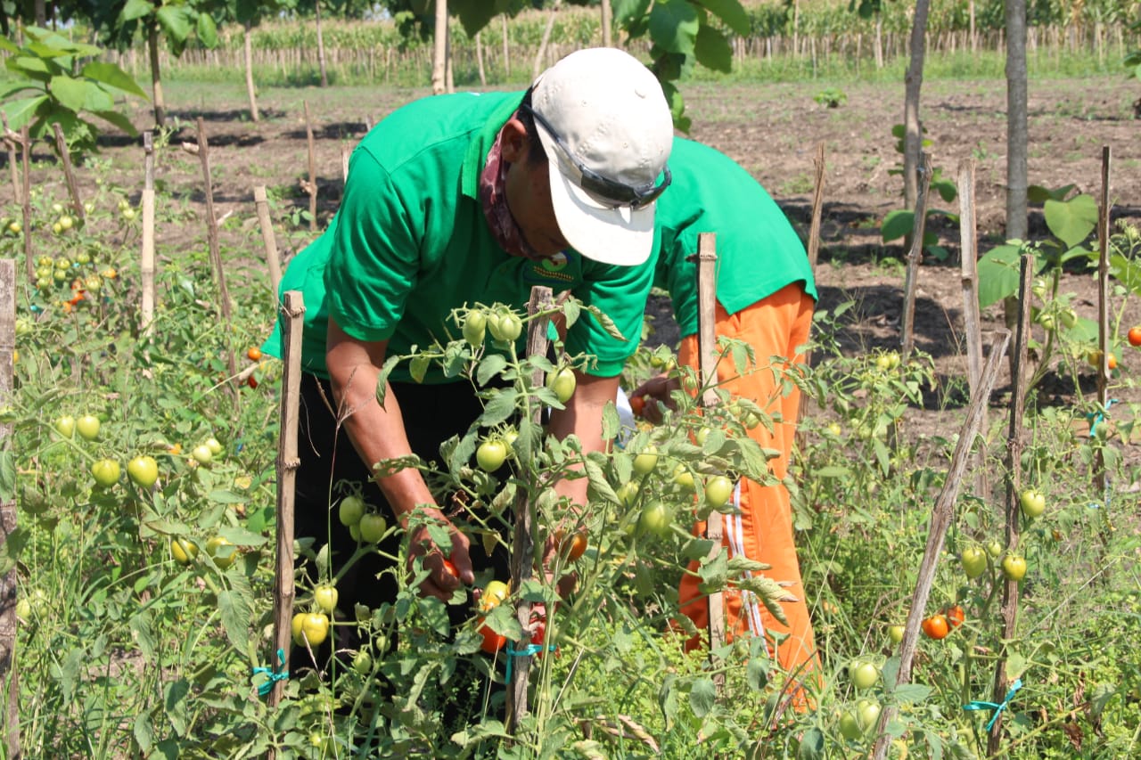 Tim CSR ITS saat memanen hasil tomat yang telah menggunakan pupuk organik di Tuban