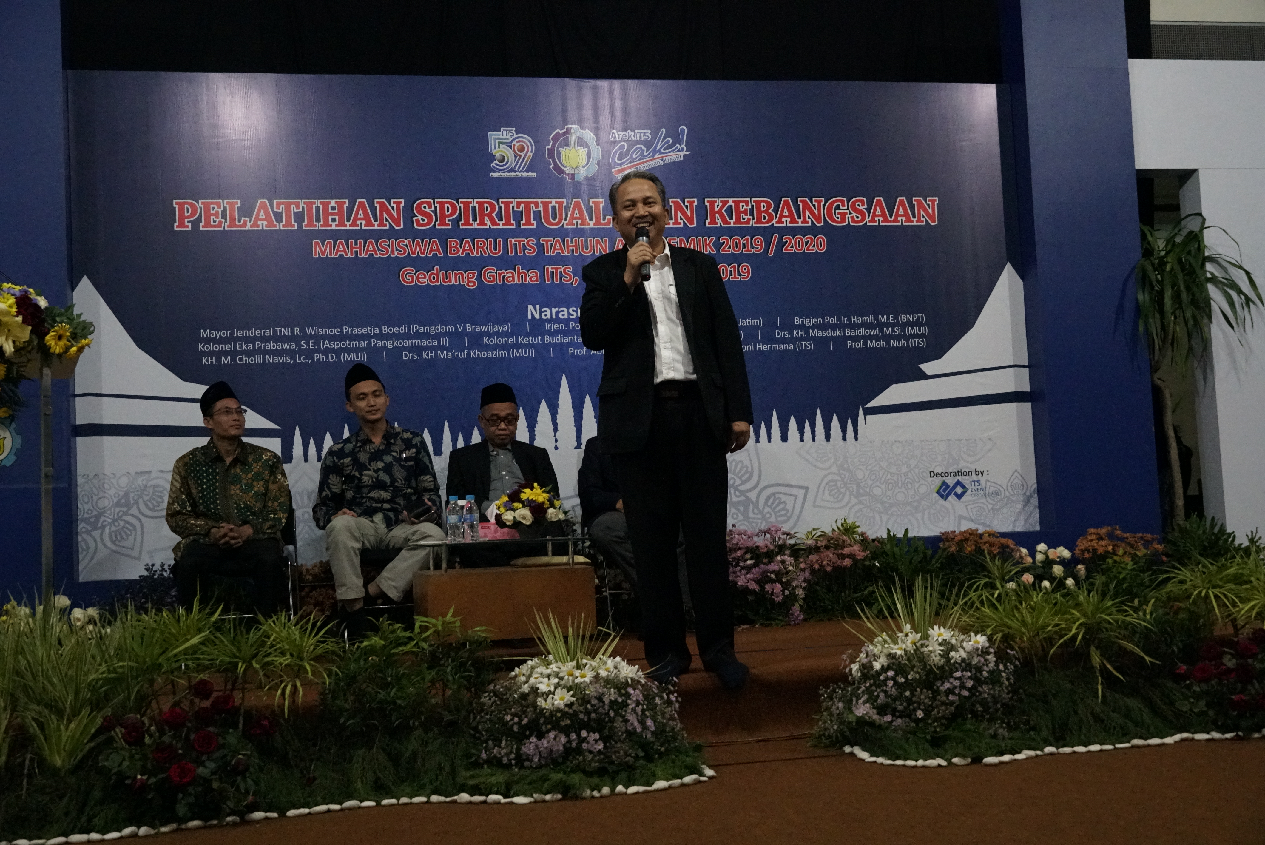 Kampus ITS, ITS News – Sebelum dilaksanakan pengukuhan mahasiswa baru Institut Teknologi Sepuluh Nopember (ITS) Surabaya, calon mahasiswa baru ITS yang beragama muslim mendapatkan pelatihan spiritual dan kebangsaan selama empat hari sejak Senin (5/8) lalu. Pada sesi materi Cerdas Intelektual dan Emosional, Prof Ir Joni Hermana MScEs PhD sebagai pemateri hari kedua memberikan wejangan kepada para calon mahasiswa agar memahami hakikat dan tujuan mereka untuk berkuliah di ITS.