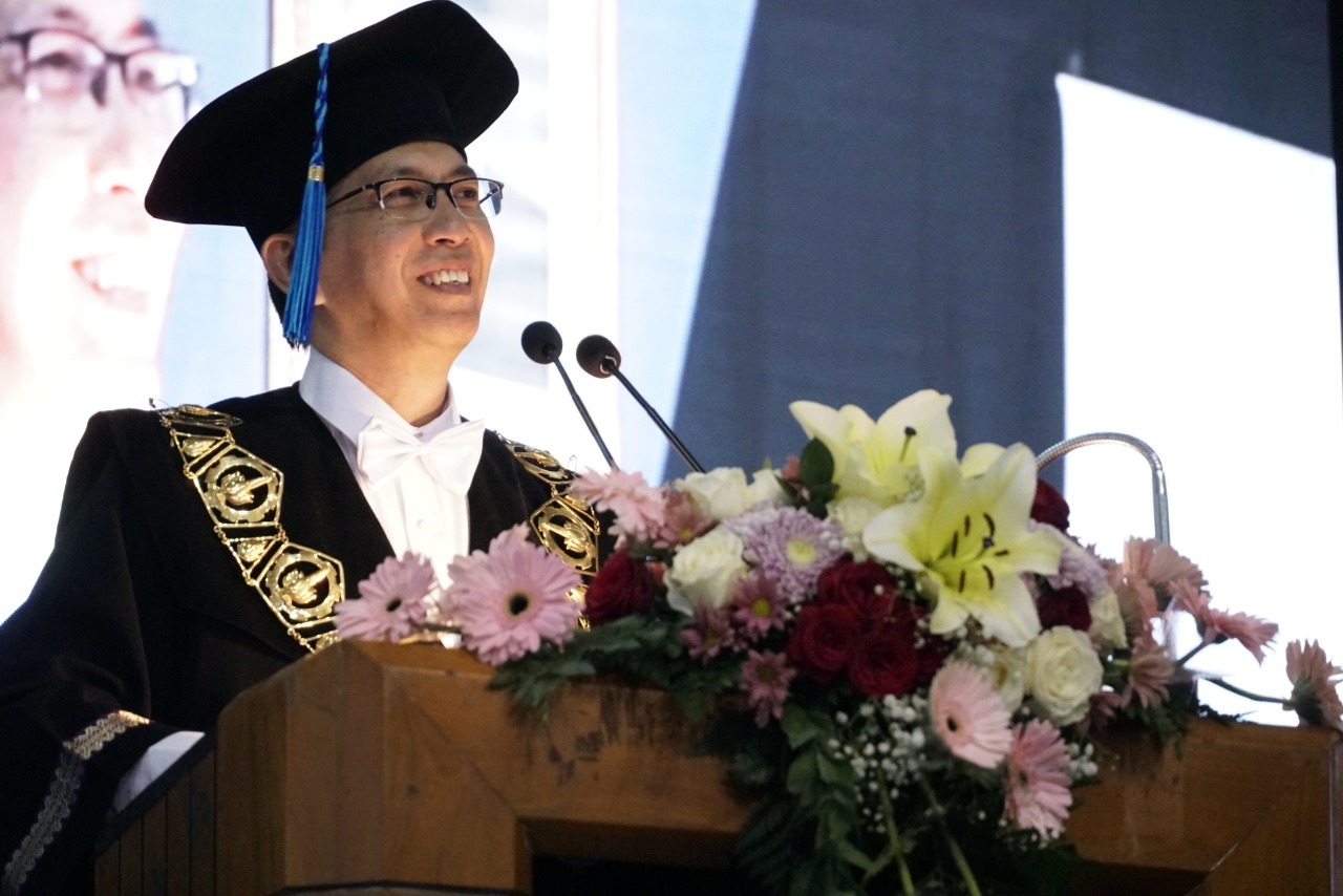 Rektor ITS Prof Mochamad Ashari memberikan sambutan sebelum melakukan pengukuhan para wisudawan di upacara wisuda ke-120 ITS