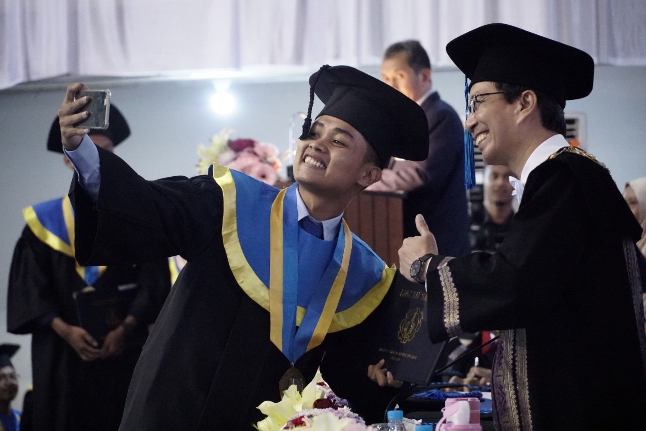 Wisudawan pun tak segan mengajak swafoto Rektor ITS Prof Mochamad Ashari (kanan) usai dikukuhkan sebagai sarjana dalam wisuda ke-120 ITS