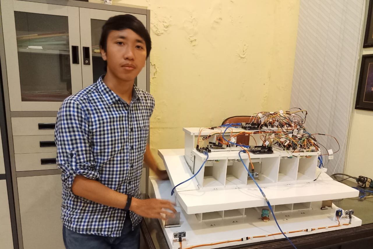 Labib Izzatur Rahman menunjukkan prototipe karyanya berupa inovasi sistem Smart Parking