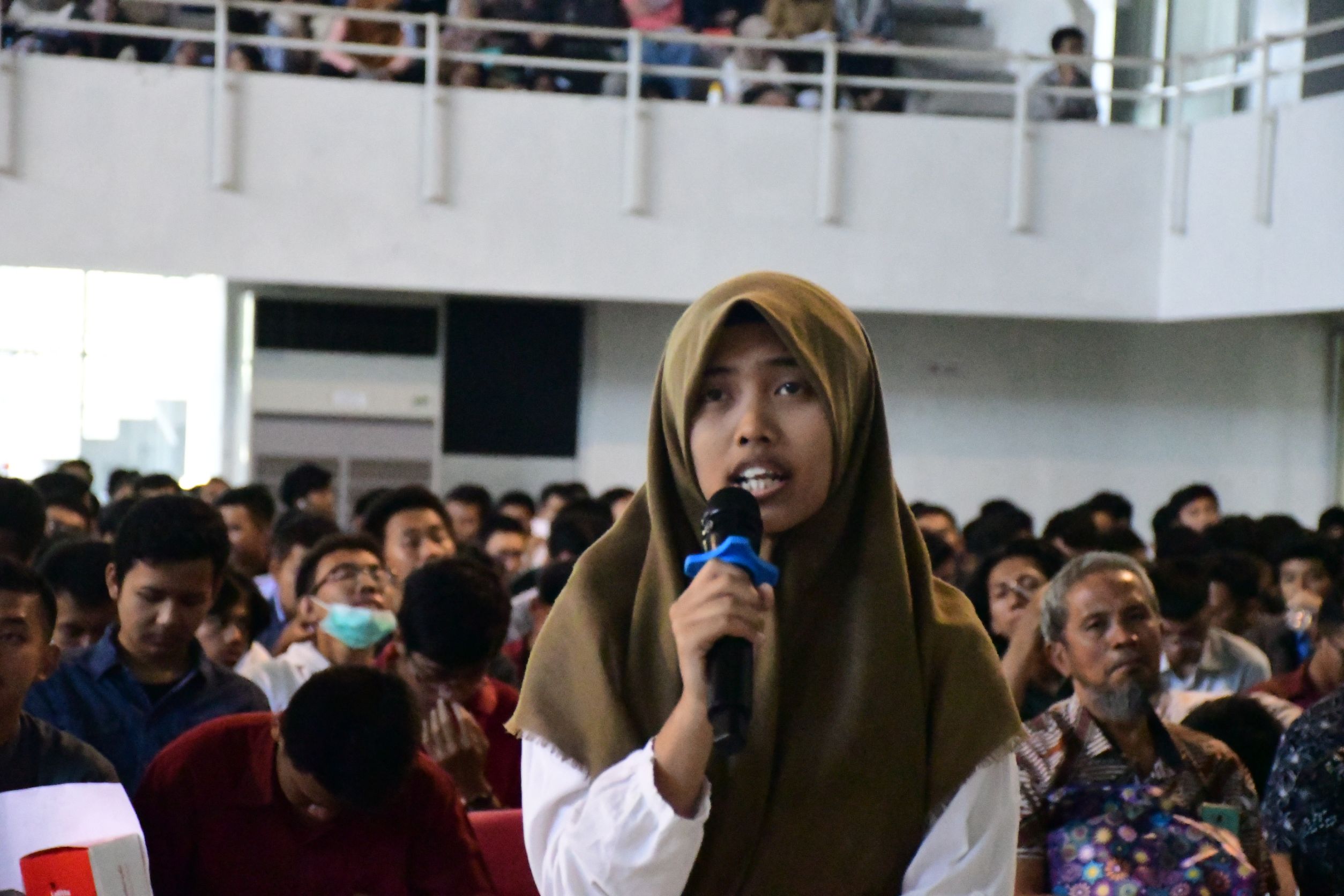 Seorang mahasiswa sedang mengajukan pertanyaan kepada narasumber ketika sesi tanya jawab