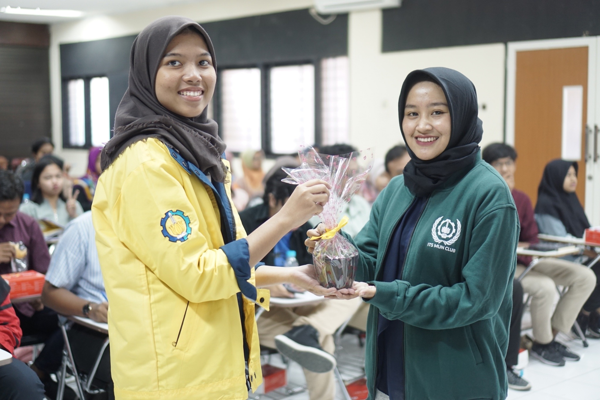 Shifa Syafira Rachmat (kiri) saat memberi bingkisan sebagai bentuk apresiasi kepada Nabilla Anindya Salma (kanan), pembicara dari ITS MUN Club pada acara BSS