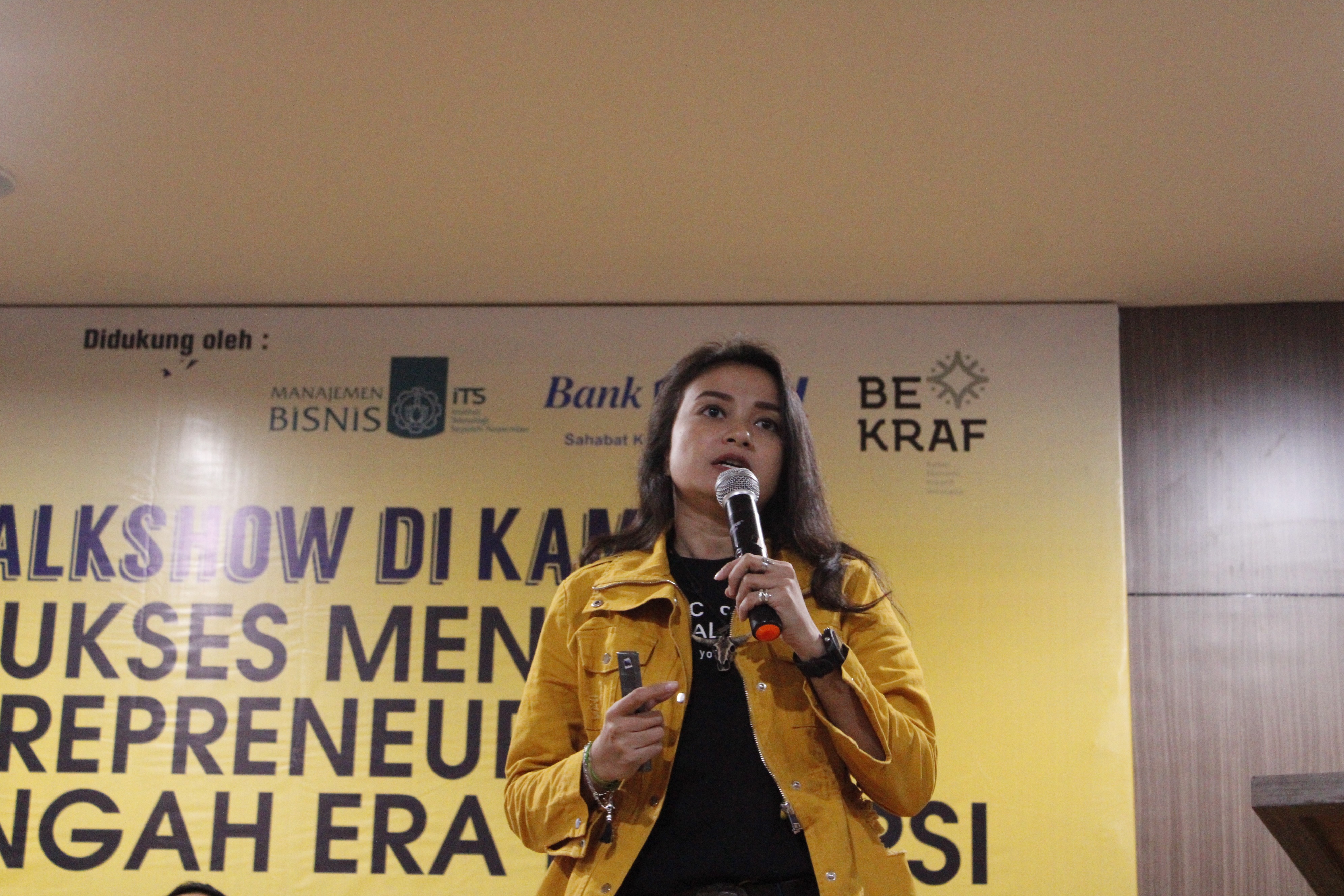 Agnes Santoso ketika sedang membagikan kisahnya pada gelar wicara bertajuk Sukses Menuju Entrepeneur Muda di Tengah Era Disrupsi di Auditorium Sinarmas ITS