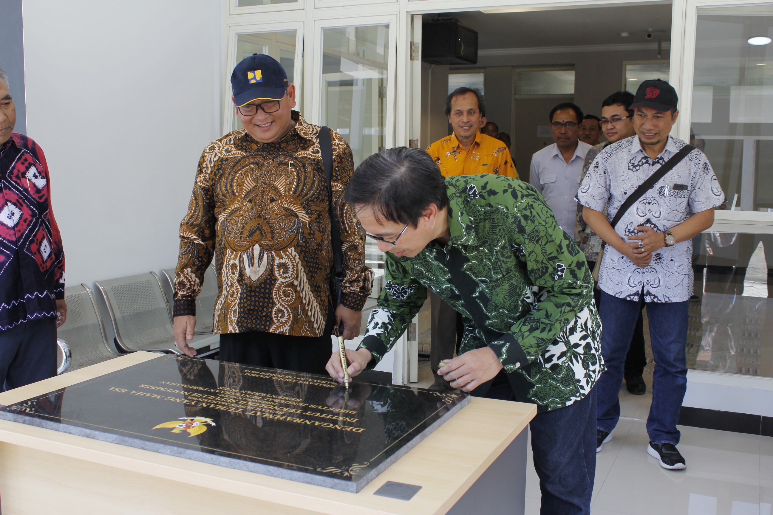 Prof Dr Ir Mochamad Ashari M Eng (kanan depan) saat menandatangani plakat peresmian Rusunawa PUPR di samping Kepala Balitbang PUPR (kiri)