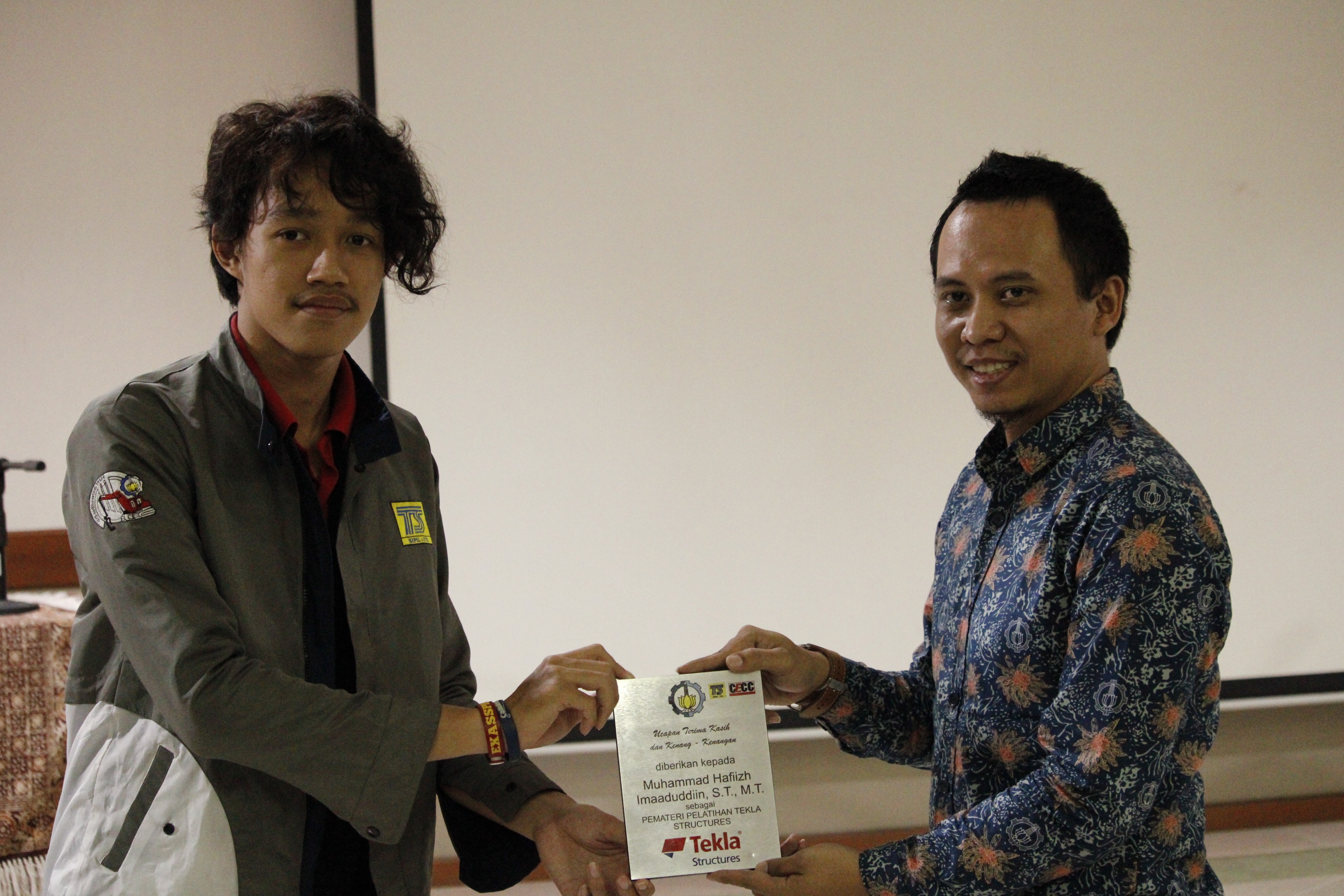 Penyerahan kenang – kenangan oleh ketua pelaksana Pelatihan Besar Tekla Structures, Michael Anthony Yansen