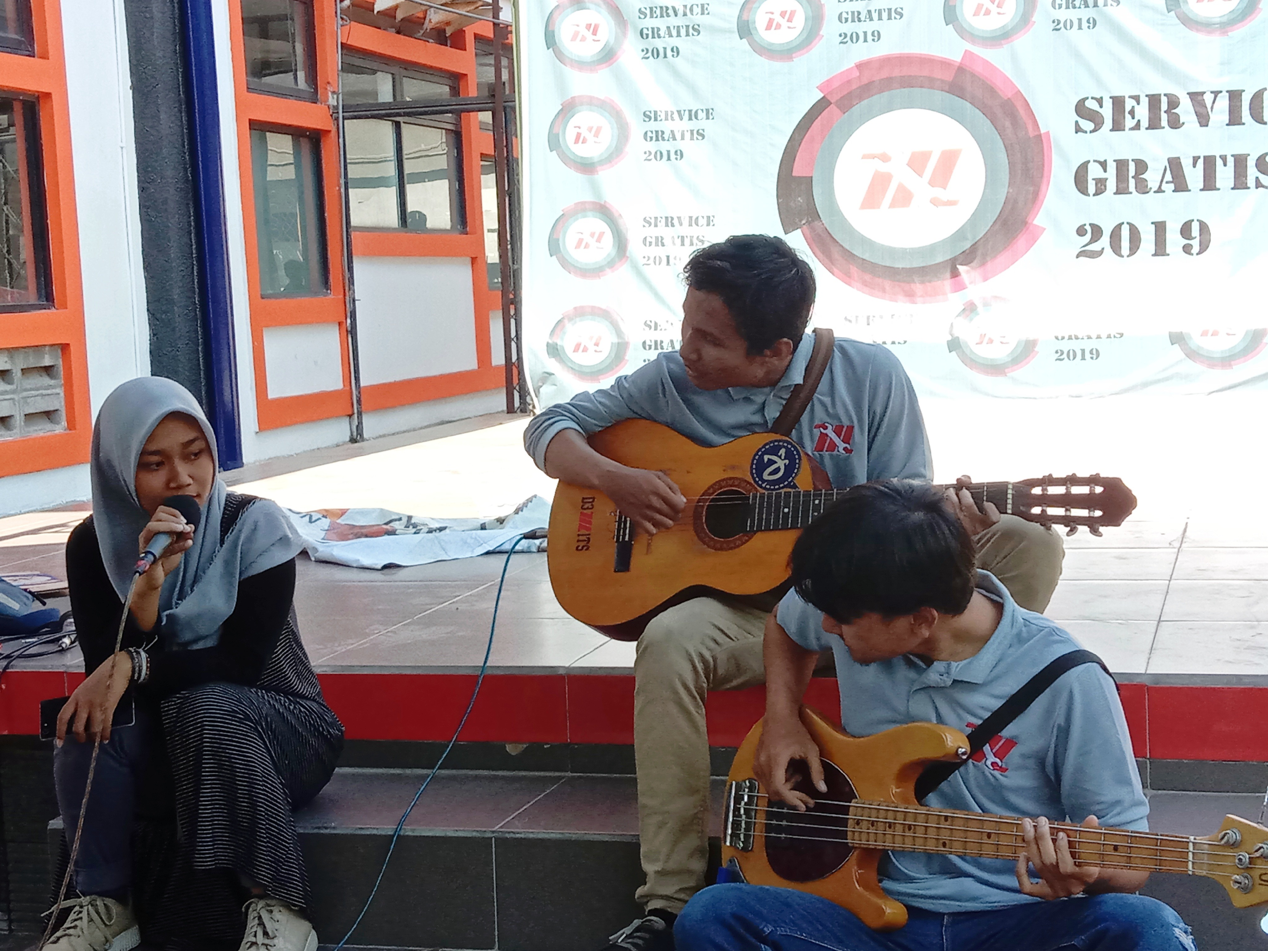 Penampilan musik dari mahasiswa Departemen Teknik Mesin Industri menghibur beberapa pengunjung yang sedang menunggu motornya.