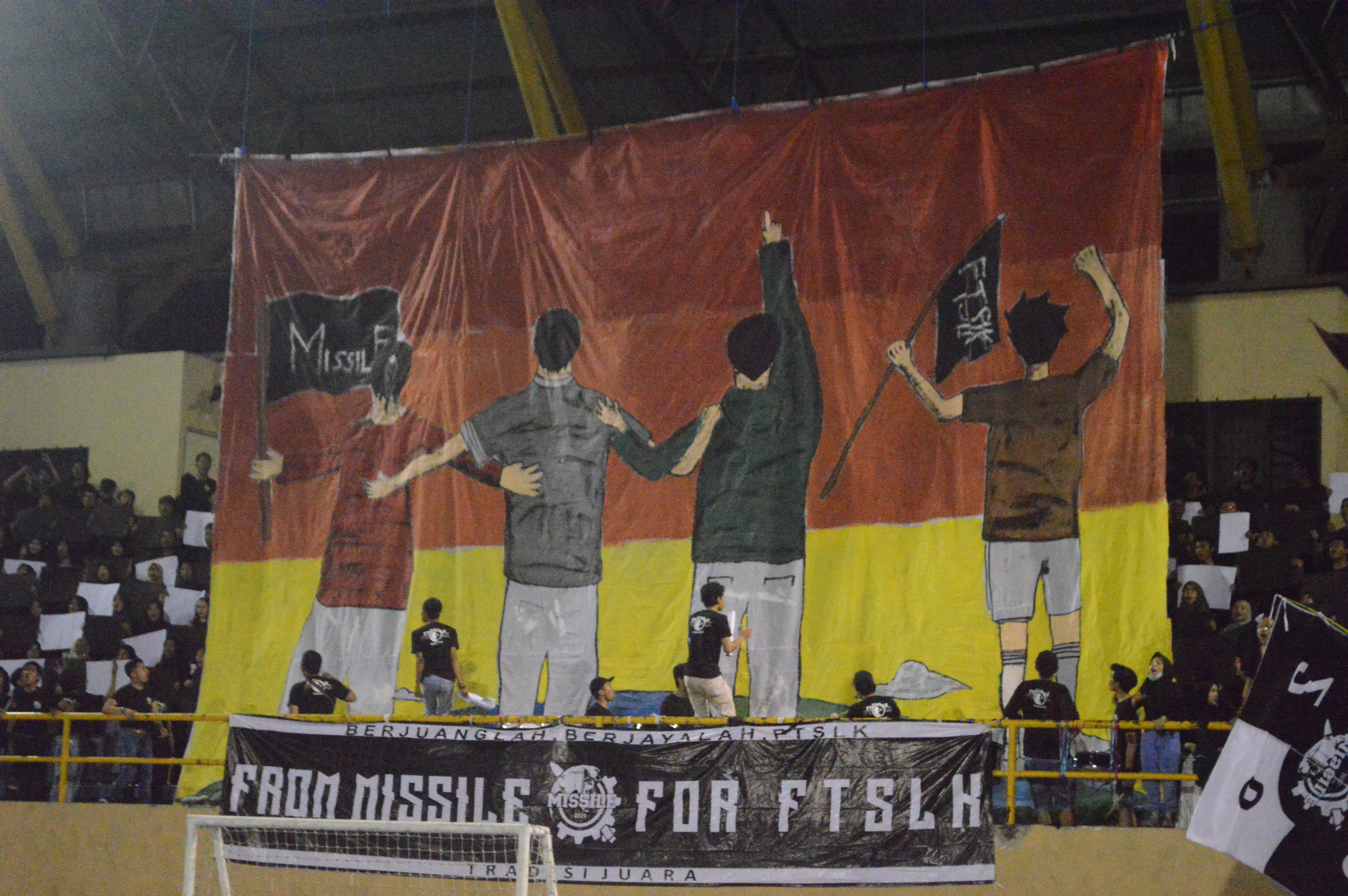 Suporter FTSLK memberikan dukungan penuh di tribun GOR Futsal ITS