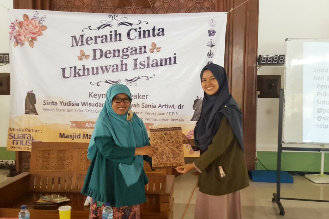 Kajian Akbar Kemuslimahan bertajuk Meraih Cinta dengan Ukhuwah Islami ini menggandeng Sinta Yusidia Wisudanti sebagai salah satu pembicara. Muslimah yang telah menelurkan puluhan buku islami ini menjelaskan, proses cinta yang dapat bertransformasi menjadi nafsu, dampak rasa cinta terhadap muslimah, dan kiat-kiat jitu yang dapat diterapkan muslimah dalam menyikapi rasa cinta tersebut.