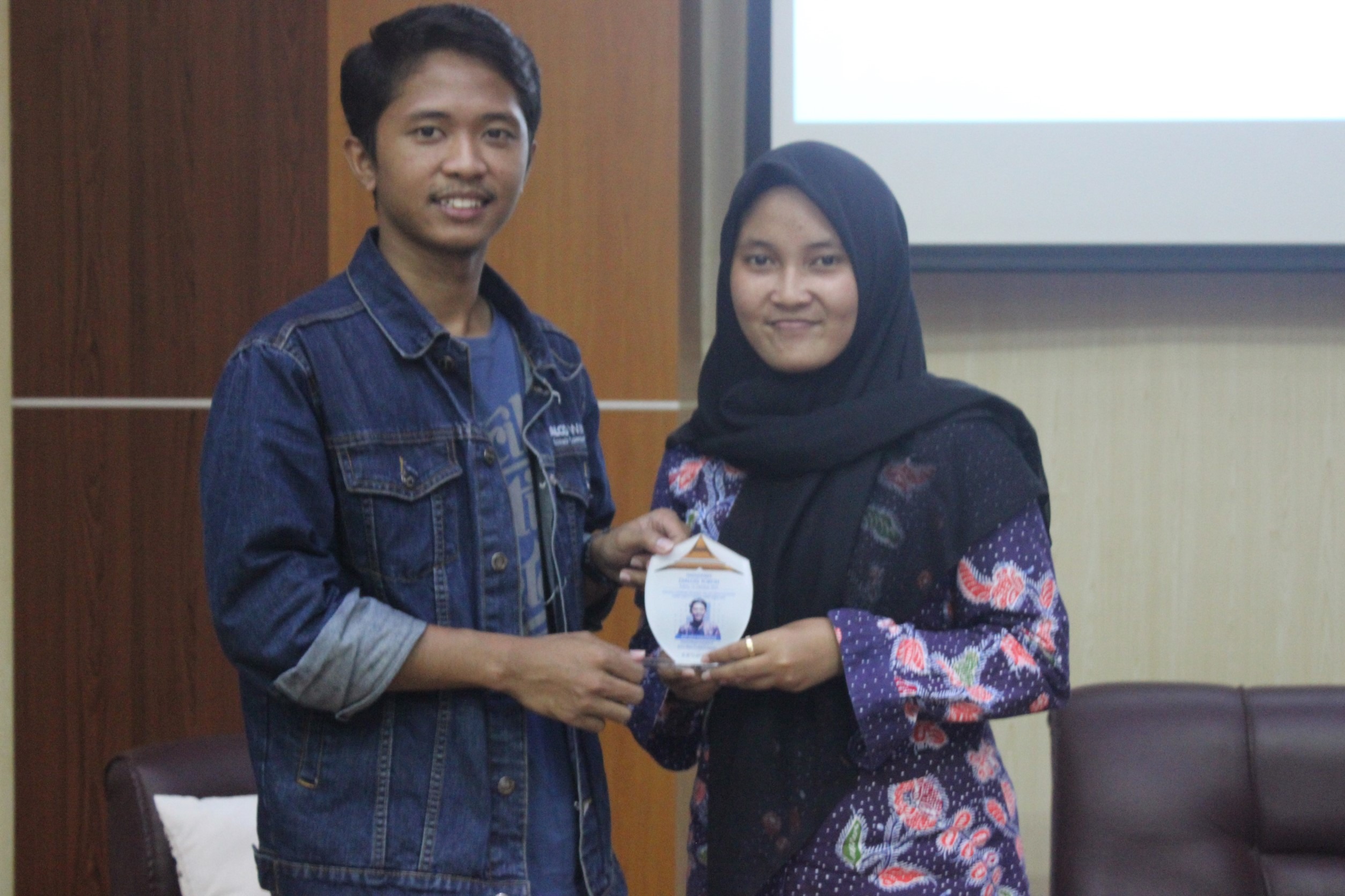Djamiatur Riskiyah (kanan), ketua pelaksana DPK, menyerahkan kenang-kenangan kepada Rofi Arga Hardiansyah (kiri), usai mengisi acara.
