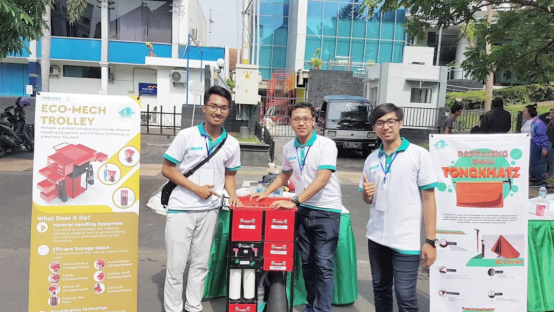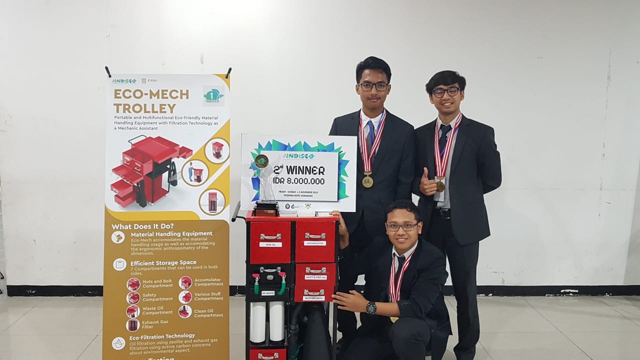 Tim Eco Mech Trolley dengan bangga memamerkan produk inovasi garapannya, berhasil meraih predikat First Runner Up dalam ajang INDISCO di tingkat ASEAN