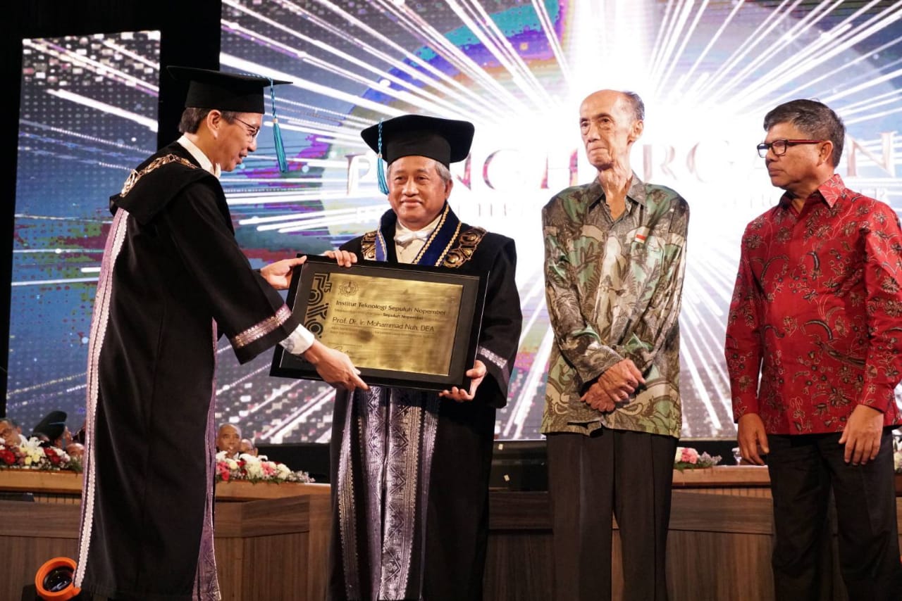 Prof Dr Ir Muhammad Nuh DEA (tengah) menerima Penghargaan Sepuluh Nopember yang diberikan langsung rektor ITS, Prof Dr Ir Mochamad Ashari M Eng atas jasanya yang besar bagi bangsa.