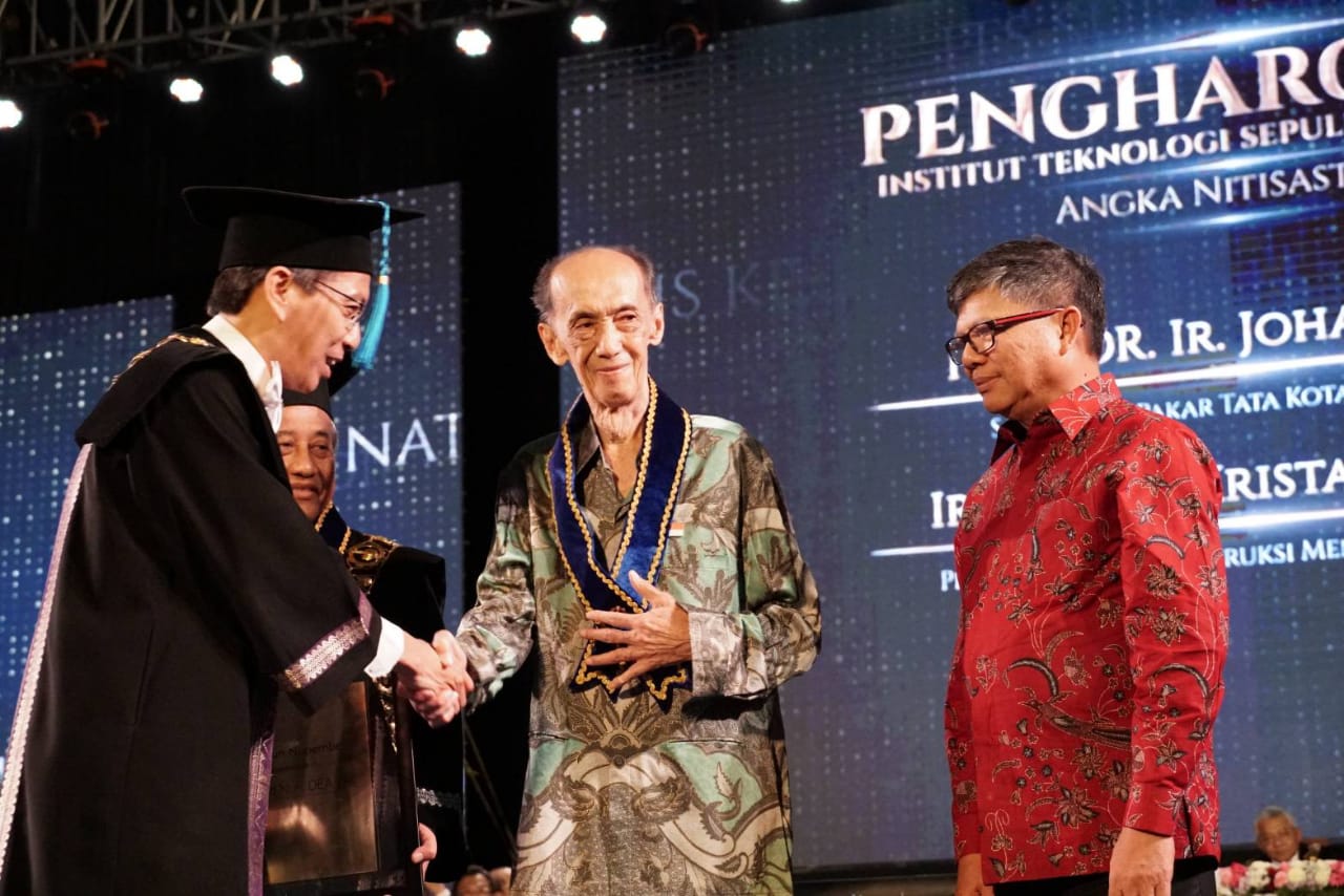 Prof Dr Ir Johan Silas (tengah) menerima Penghargaan Angka Nitisastro yang diberikan Prof Dr Ir Mochamad Ashari M Eng (kiri) atas jasanya di bidang tata kota Indonesia