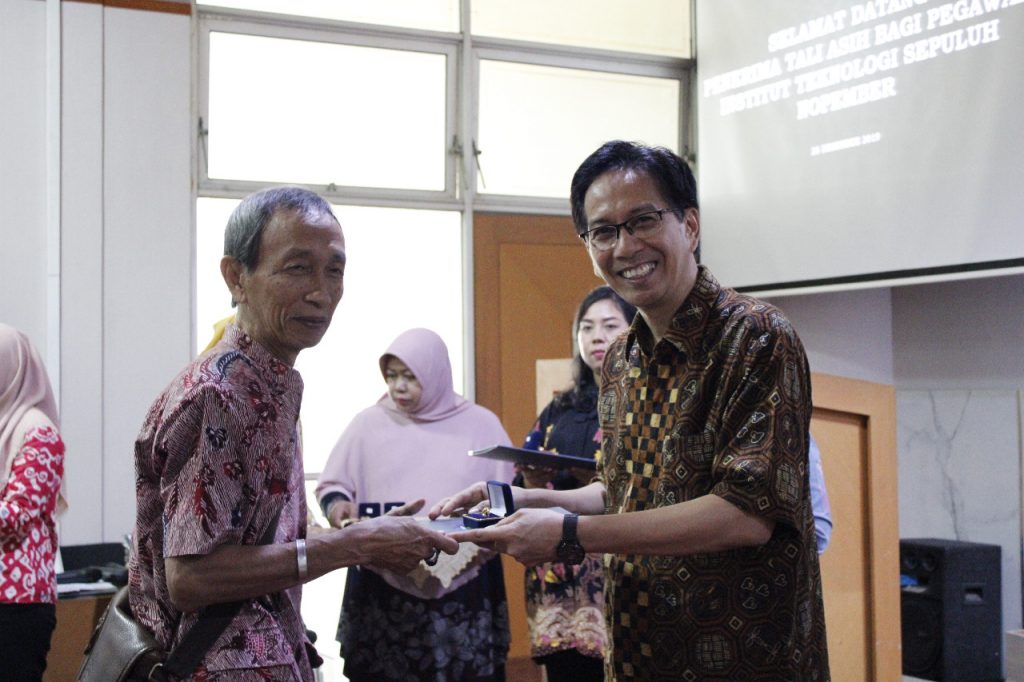 Rektor ITS Prof Dr Ir Mochamad Ashari MEng (kanan) saat memberikan tali asih kepada salah satu pegawai purna tugas ITS