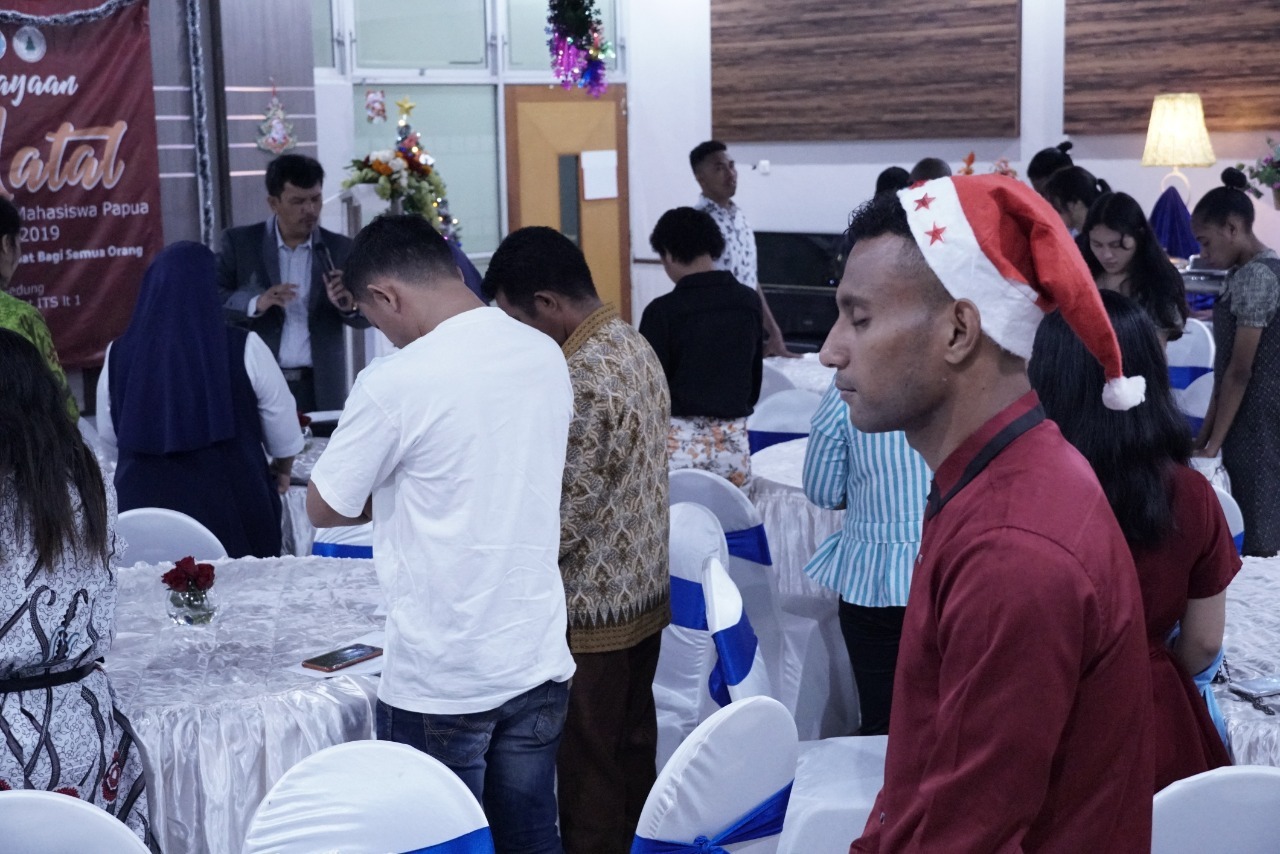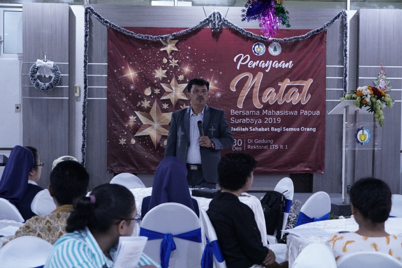 Kampus ITS, ITS News — Momen natal dimanfaatkan oleh Institut Teknologi Sepuluh Nopember (ITS) untuk membangun kekeluargaan antar mahasiswa Papua yang menjalani kuliah di berbagai universitas di Surabaya. Mengangkat tema Jadilah Sahabat bagi Semua Orang, kebaktian natal kali ini dipimpin langsung oleh pendeta Japikir Lumban Raja di Rektorat ITS, Senin (30/12).
