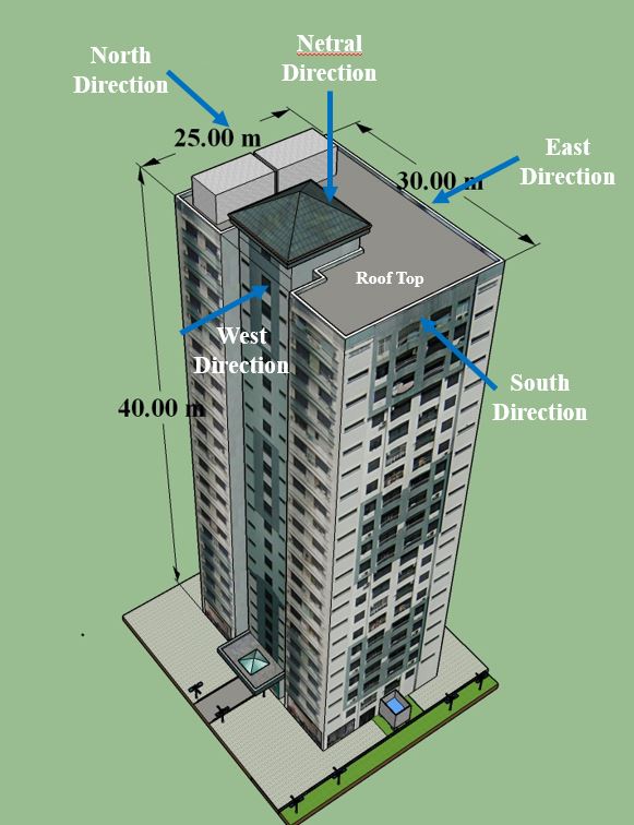 Skema ukuran bangunan dan arah angin yang mengenai bangunan