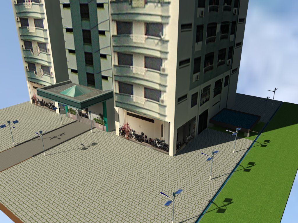 Bentuk desain peletakan kolam tampungan air hujan di samping bangunan bertingkat tinggi yang dirancang dari kajian Ir Ismail Sa`ud M MT