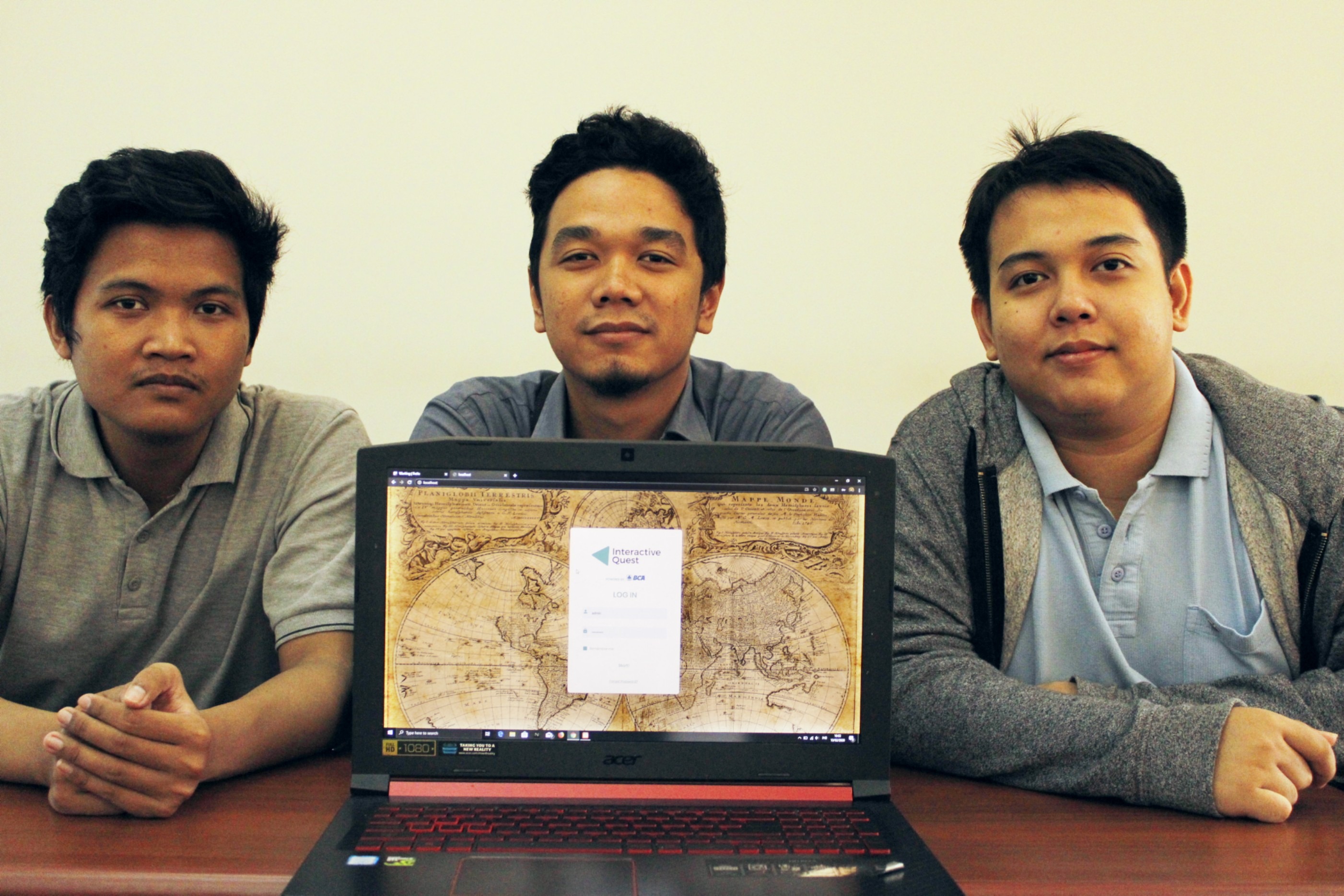 (dari kiri) (dari kiri) Agung Dwi Wicaksono, Sageta May Ardinata, Muhammad Affan Ghaffar saat menunjukkan aplikasi Interactive Quest