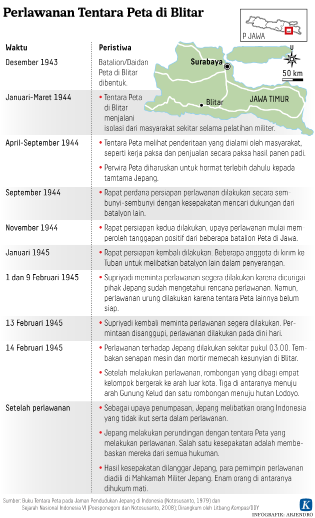 Kronologi pemberontakan PETAKenyataan pahit ini menuai kecaman keras dari Supriyadi, seorang pemuda berusia 22 tahun. Ia menyiasati rapat rahasia untuk merencanakan perlawanan yang dilakukan sejak pertengahan September 1944. Para tentara tersebut mulai menjalankan aksinya di Blitar. Namun, perlawanan tersebut tidaklah berjalan mulus karena Jepang berhasil mengepung tentara pemberontak dengan mengandalkan bantuan warga sekitar yang tidak ikut melawan serta memanggil bala bantuan dari Malang.