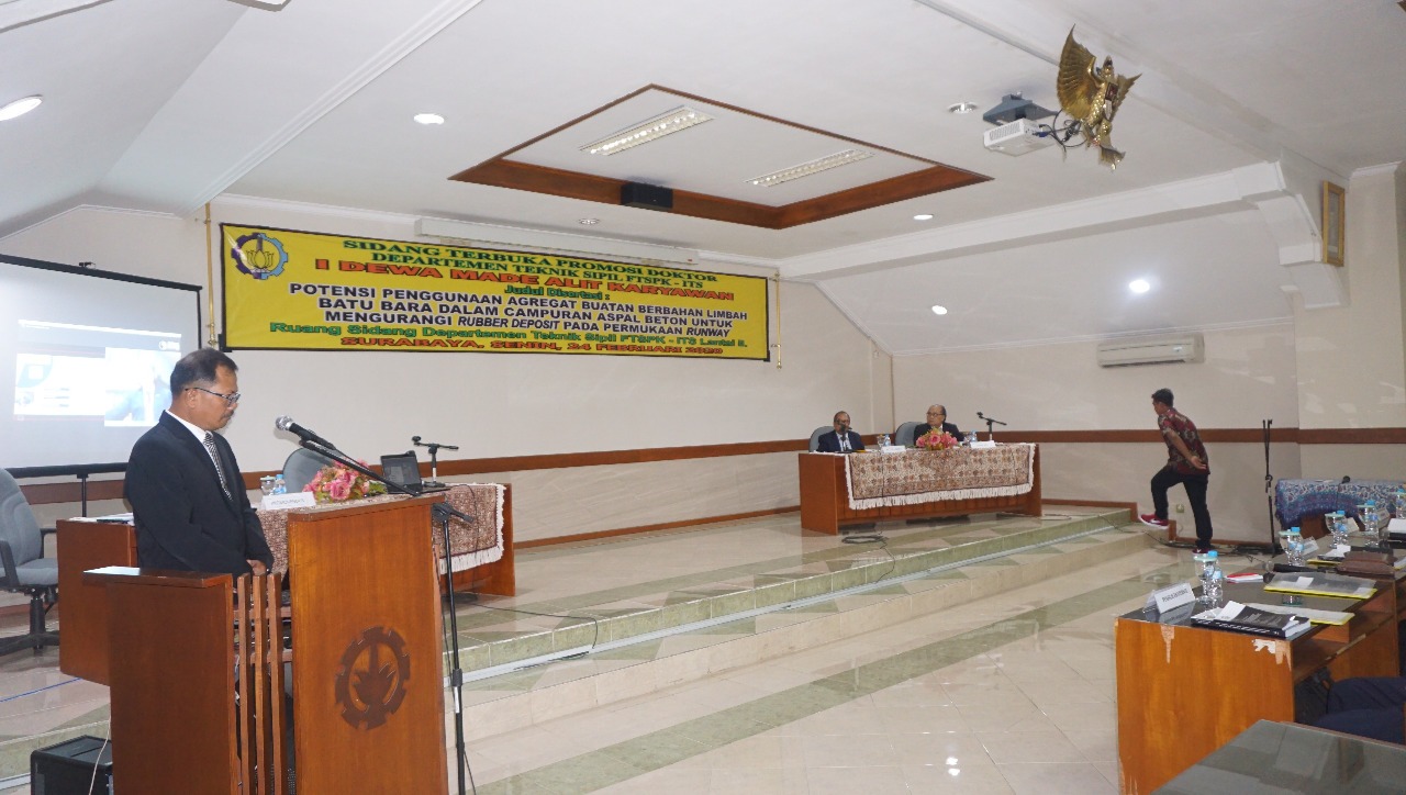 Bertempat di ruang sidang Departemen Teknik Sipil, Dewa mempresentasikan penelitiannya mengenai potensi penggunaan agregat buatan dari limbah batu bara (fly ash) dalam campuran aspal beton untuk mengurangi rubber deposit pada permukaan runaway.