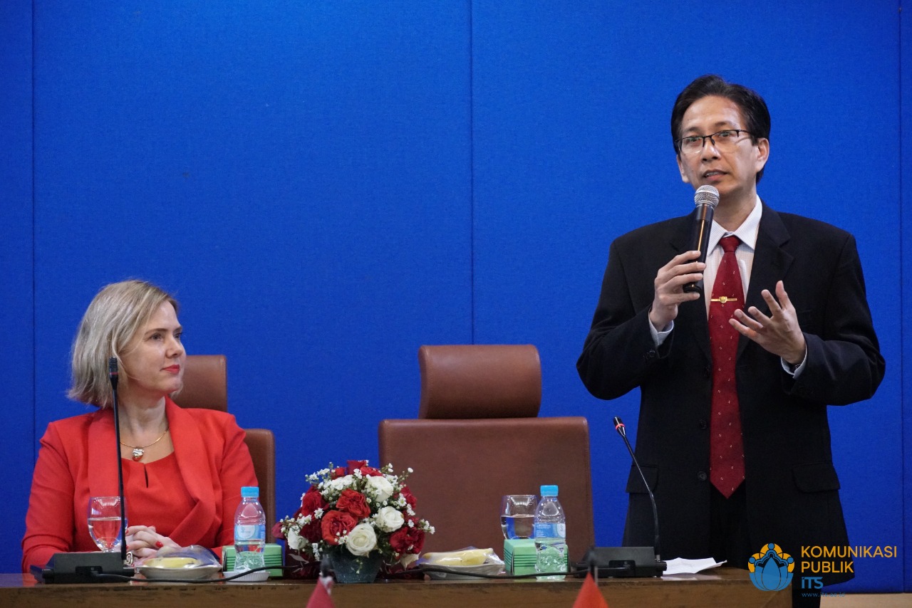 Rektor ITS Prof Mochamad Ashari (kanan) menyampaikan sambutannya atas kunjungan Menteri Infrastruktur dan Manajemen Air Belanda Cora van Nieuwenhuizen (kiri) beserta rombongan