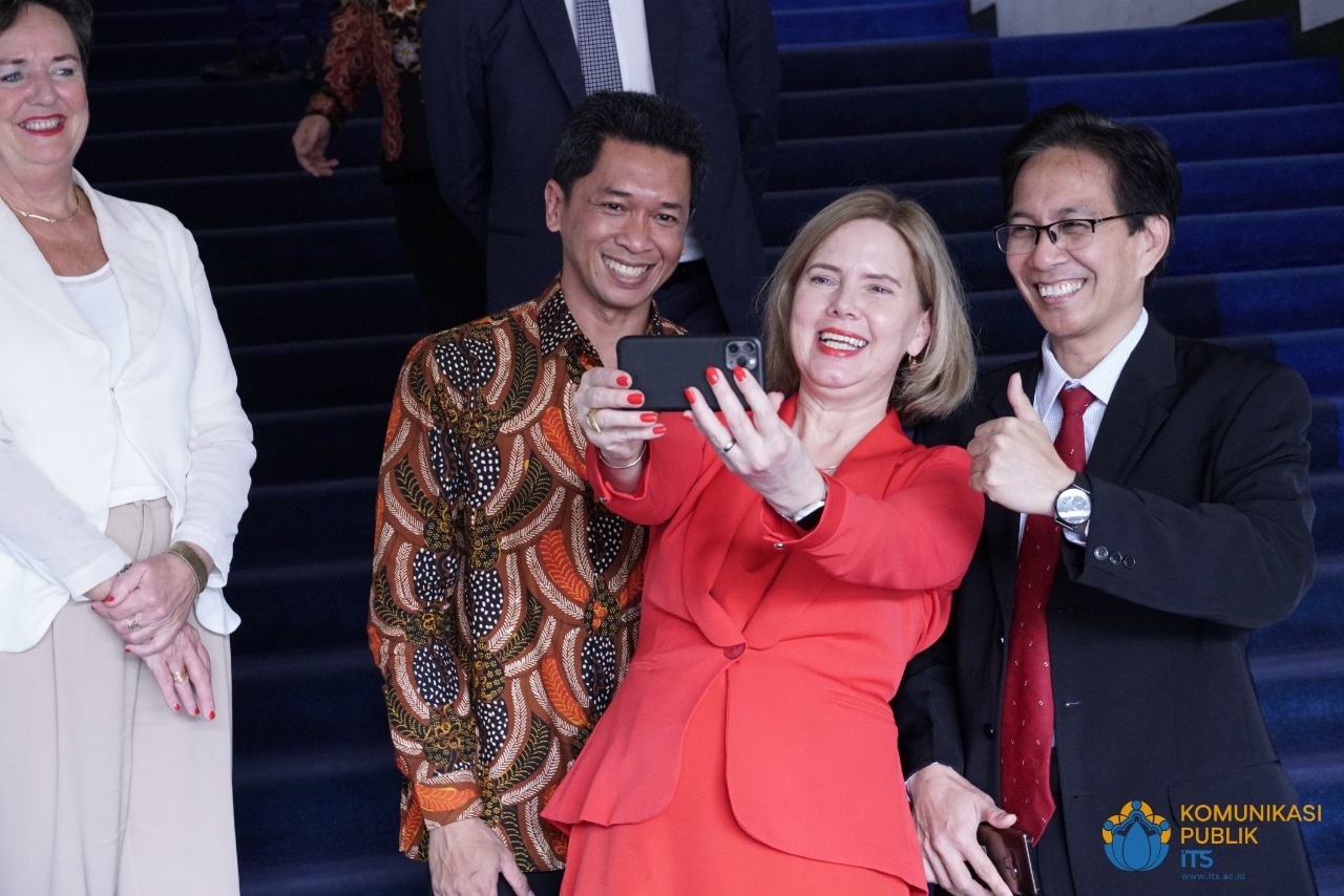 Menteri Infrastruktur dan Manajemen Air Belanda Cora van Nieuwenhuizen (tengah) mengajak swafoto Rektor ITS Prof Mochamad Ashari (kanan) dan Wakil Rektor IV ITS Bambang Pramujati