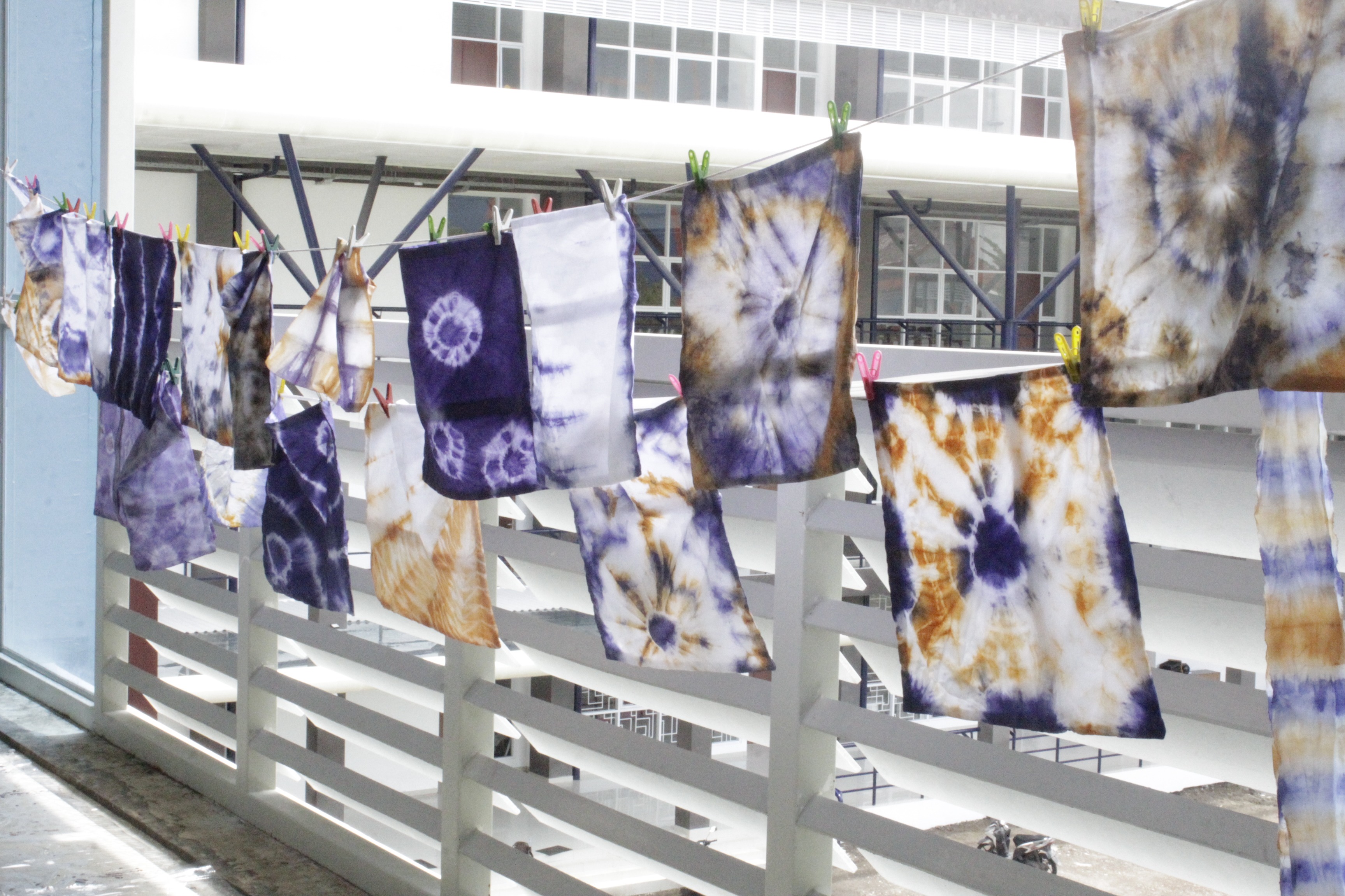 Tak hanya itu, Lea juga menjelaskan bahwa dalam pembuatan tie dye dapat pula memanfaatkan bantuan alat untuk menghasilkan coraknya. Seperti pipa, batu, kelereng, penjepit kertas, dan lain sebagainya. “Pipa digunakan untuk membuat motif garis-garis, sedangkan kelereng digunakan agar muncul motif bulat-bulat,” paparnya.