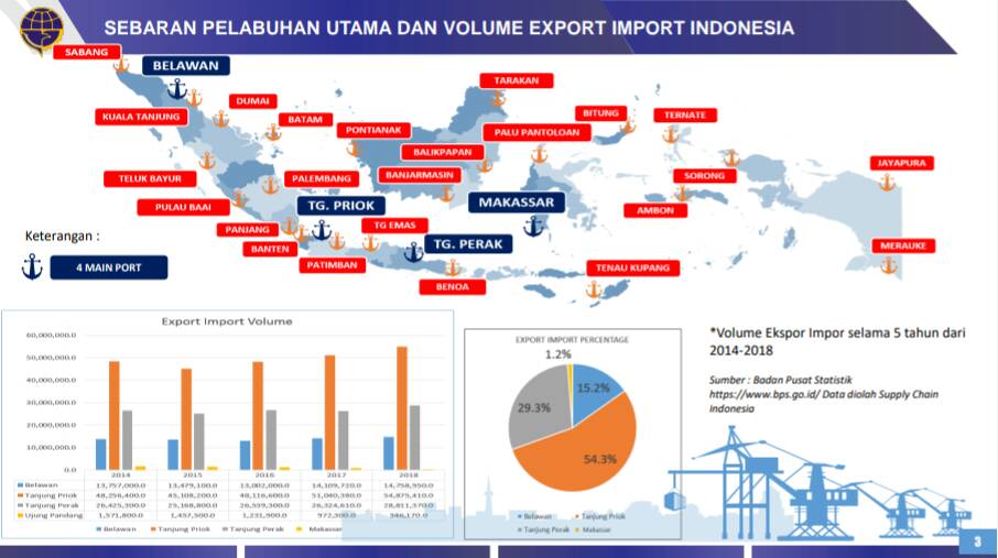 Subagiyo menambahkan bahwa capaian ini berhubungan dengan volume ekspor-impor barang yang terangkut dari empat pelabuhan utama Indonesia, yakni Pelabuhan Belawan, Tanjung Priok, Tanjung Perak, dan Makassar. Dari data Badan Pusat Statistik (BPS) sampai dengan Agustus 2019, Pelabuhan Tanjung Priok masih menempati urutan pertama dalam kegiatan ekspor barang. “Tercatat nilai ekspor mencapai 14,28 miliar dolar,” sambungnya.