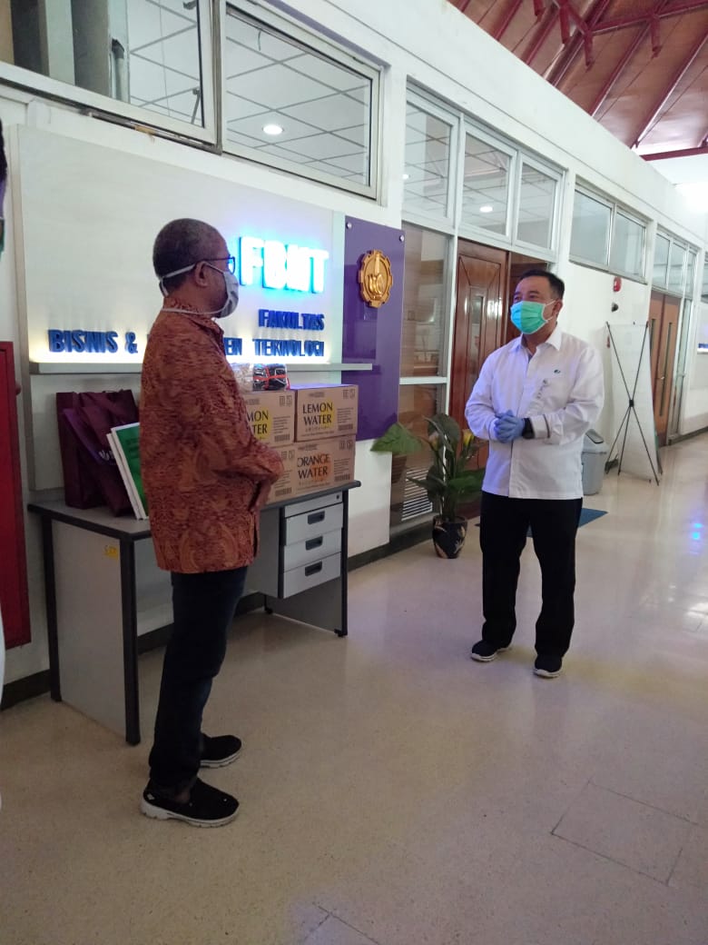 Penyerahan bantuan untuk relawan Covid-19 ITS oleh Kepala Kantor Cabang Surabaya Darmo BPJS Ketenagakerjaan, Guguk Heru Triyoko (kanan) kepada Dekan Fakultas Desain Kreatif dan Bisnis Digital ITS, Imam Baihaqi ST MSc PhD