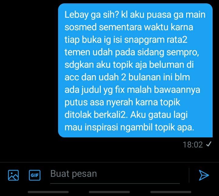 Lagipula, apa yang ditampilkan seseorang di media sosial hanyalah persentase kecil dari seluruh kehidupannya. Tidak sepenuhnya mereka mengekspos apa saja yang mereka rasakan dan pikirkan, apa yang telah mereka lalui, maupun apa saja yang sebenarnya mereka miliki.