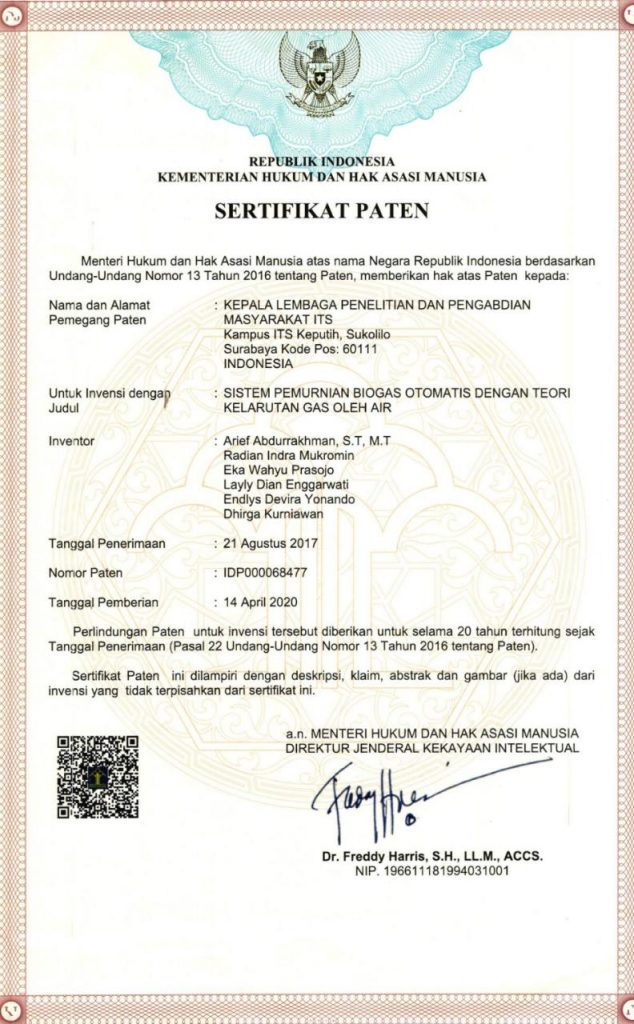 Sertifikat Hak Paten untuk Produk Sistem Pemurnian Biogas Otomatis dengan Teori Kelarutan Gas oleh Air yang diterima dosen ITS Arief Abdurrakhman ST MT dan tim