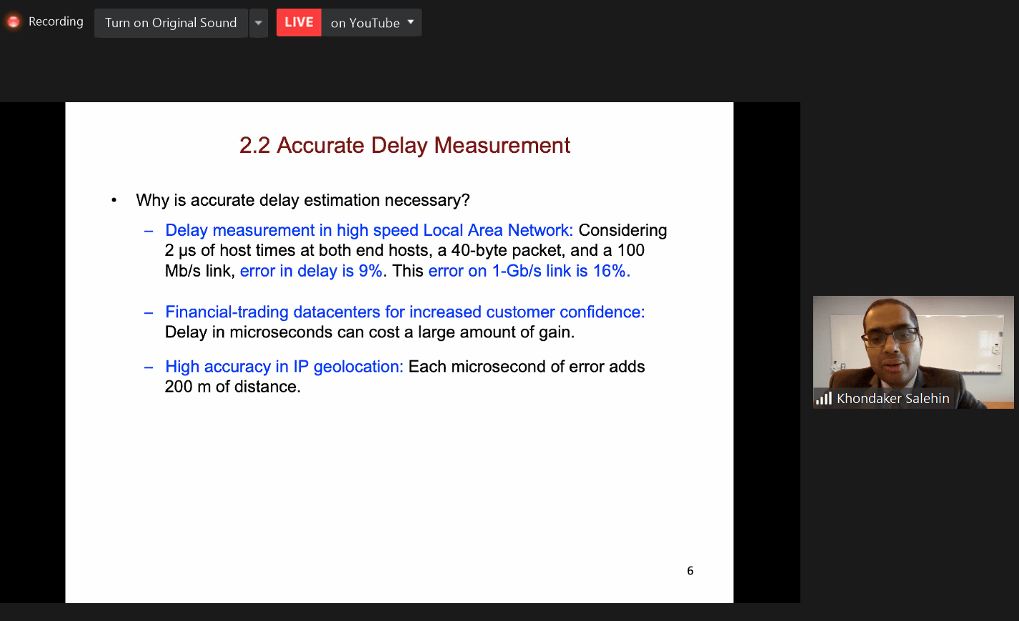 Dalam topik pertama yang berjudul Improvement of Delay Estimation over End-to-End Paths, Profesor Salehin menjelaskan mengenai konsep waktu tunda dalam jaringan komputer. Jaringan Komputer sendiri ialah teknologi yang dapat menghubungkan dua atau lebih komputer dan perangkat pendukung komputer lainnya sehingga memungkinkan antar unit komputer untuk berbagi data.