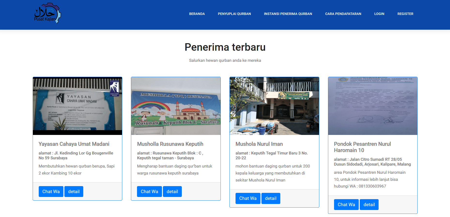 Tampilan instansi penerima kurban yang bergabung pada program Tebar Qurban pada web resmi Pusat Kajian Halal ITS