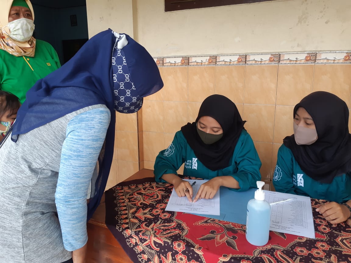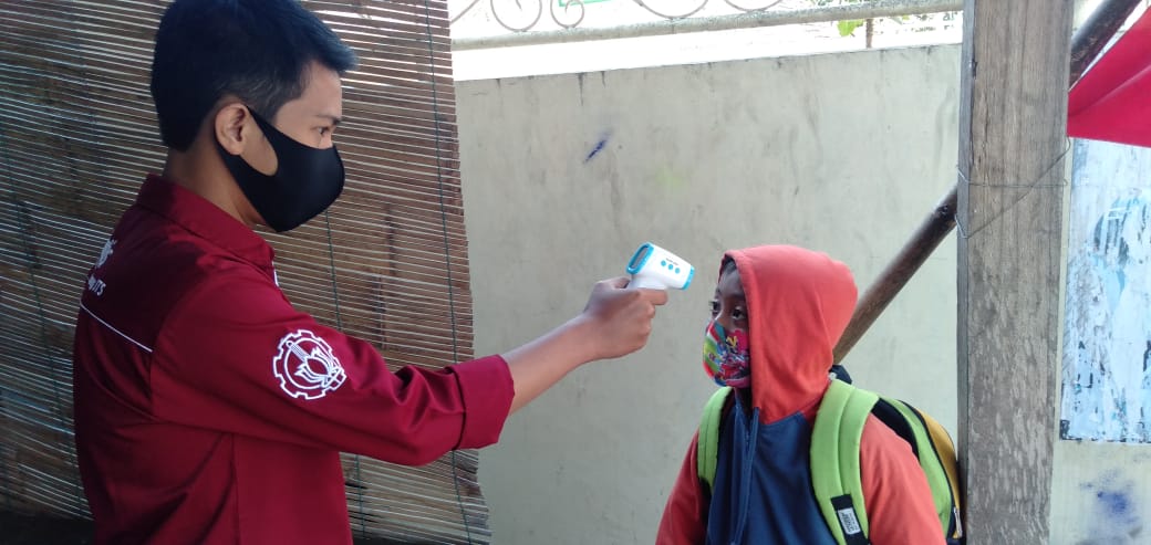 Mahasiswa ITS melakukan pemeriksaan suhu kepada murid SDN 1 Kauman.