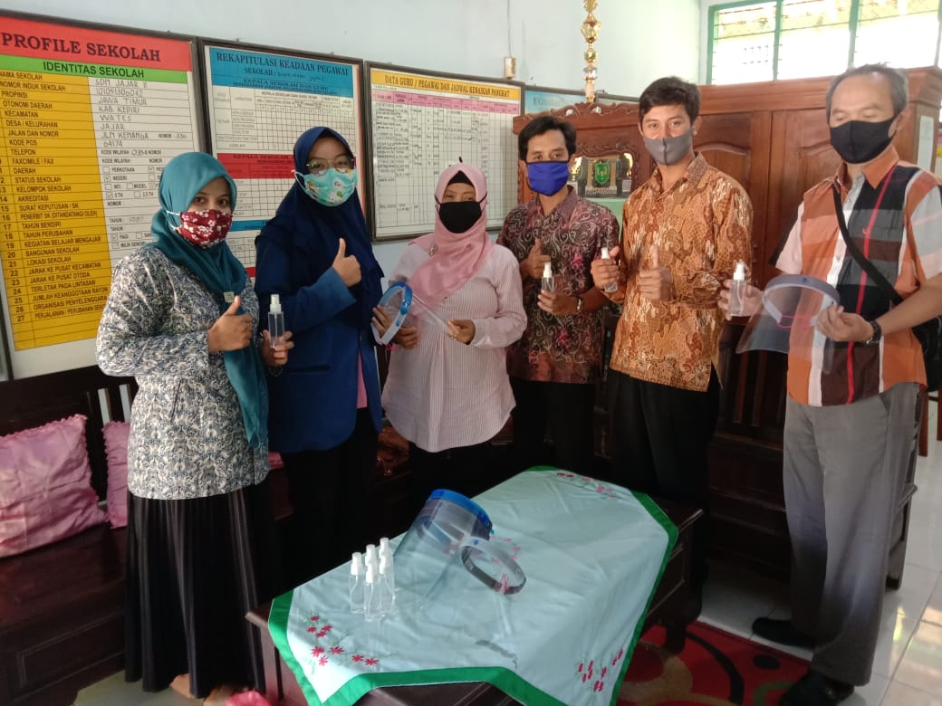 Pemberian hand sanitizer dan faceshield dari tim KKNT ITS 11 kepada pihak sekolah