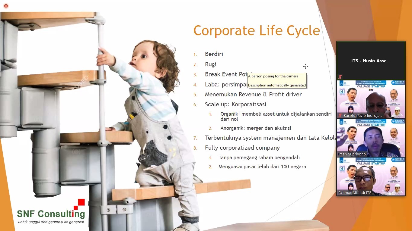 Kampus ITS, ITS News — Di era pesatnya perkembangan teknologi saat ini, semakin banyak startup yang bermunculan dengan bergerak dan berinovasi di berbagai bidang. Selaras dengan hal itu, Institut Teknologi Sepuluh Nopember (ITS) melalui Direktorat Inovasi dan Kawasan Sains Teknologi (DIKST) ITS mengadakan Webinar Valuasi Startup yang membahas siklus pengembangan bisnis pada Kamis, (1/10) lalu.
