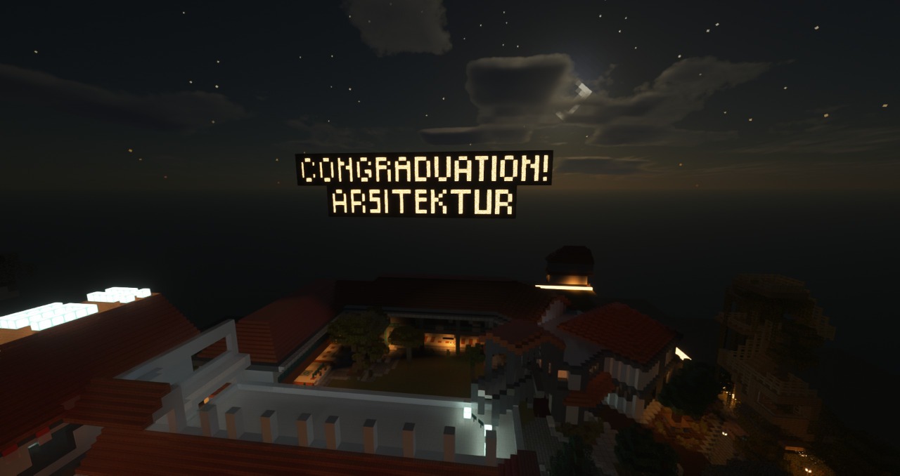 Dan istimewanya, pada wisuda kali ini mahasiswa baru dapat turut memeriahkannya dengan mengirim ucapan selamat kepada para wisudawan. Melalui bangunan yang mereka bangun di dunia Minecraft, mereka dapat membuat ucapan selamat sekreatif mungkin. “Meskipun tidak belum pernah ke kampus ITS, mereka tetap berusaha memberikan yang terbaik melalui bangunan departemen yang mereka buat,” ujar wisudawan dari Departemen Teknik Informatika tersebut.