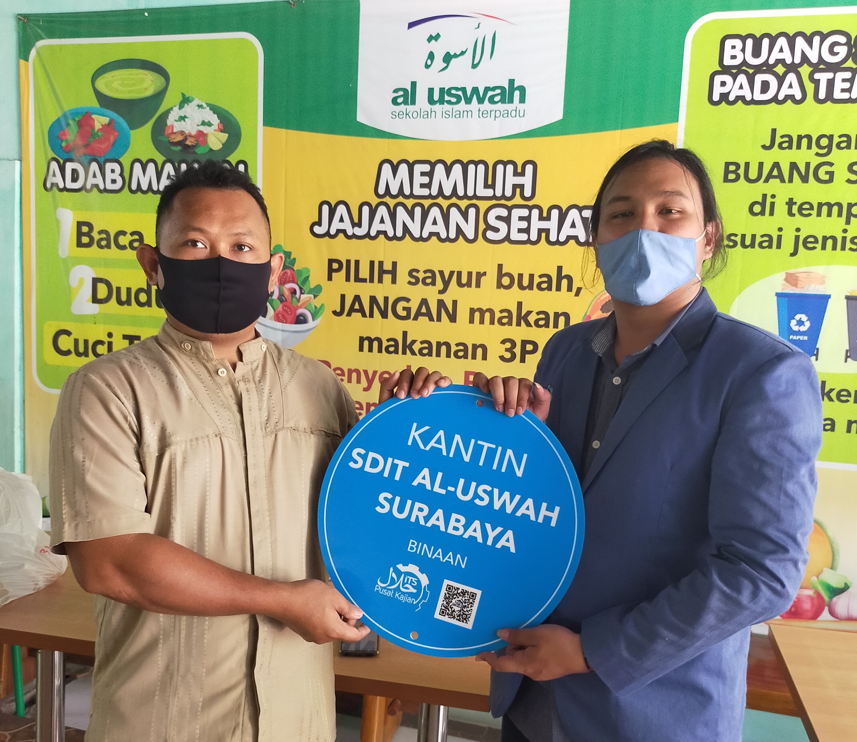 Pemasangan logo binaan halal ITS di kantin sekolah SDIT Al-Uswah Surabaya