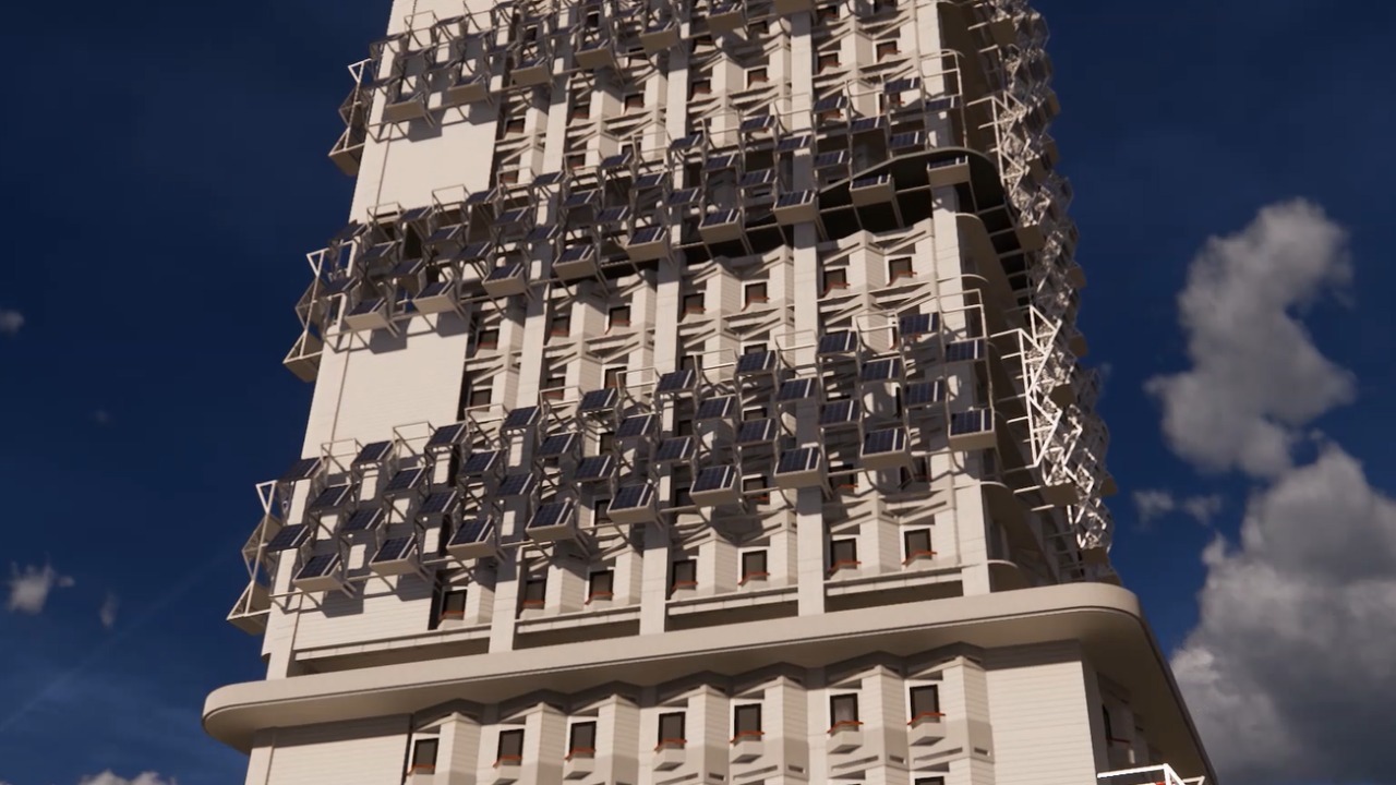 Tampak dari layer terluar Among Raga yang berupa panel surya sebagai sumber energi dan penangkap air hujan untuk keberlanjutan bangunan