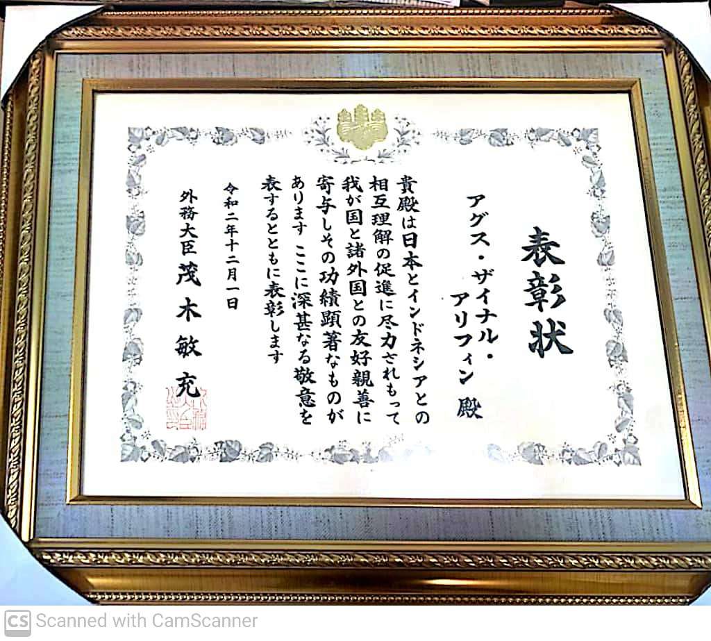 Penghargaan yang diterima Prof Agus Zainal Arifin dari ITS atas jasanya dalam meningkatkan saling pengertian antara Jepang dan Indonesia