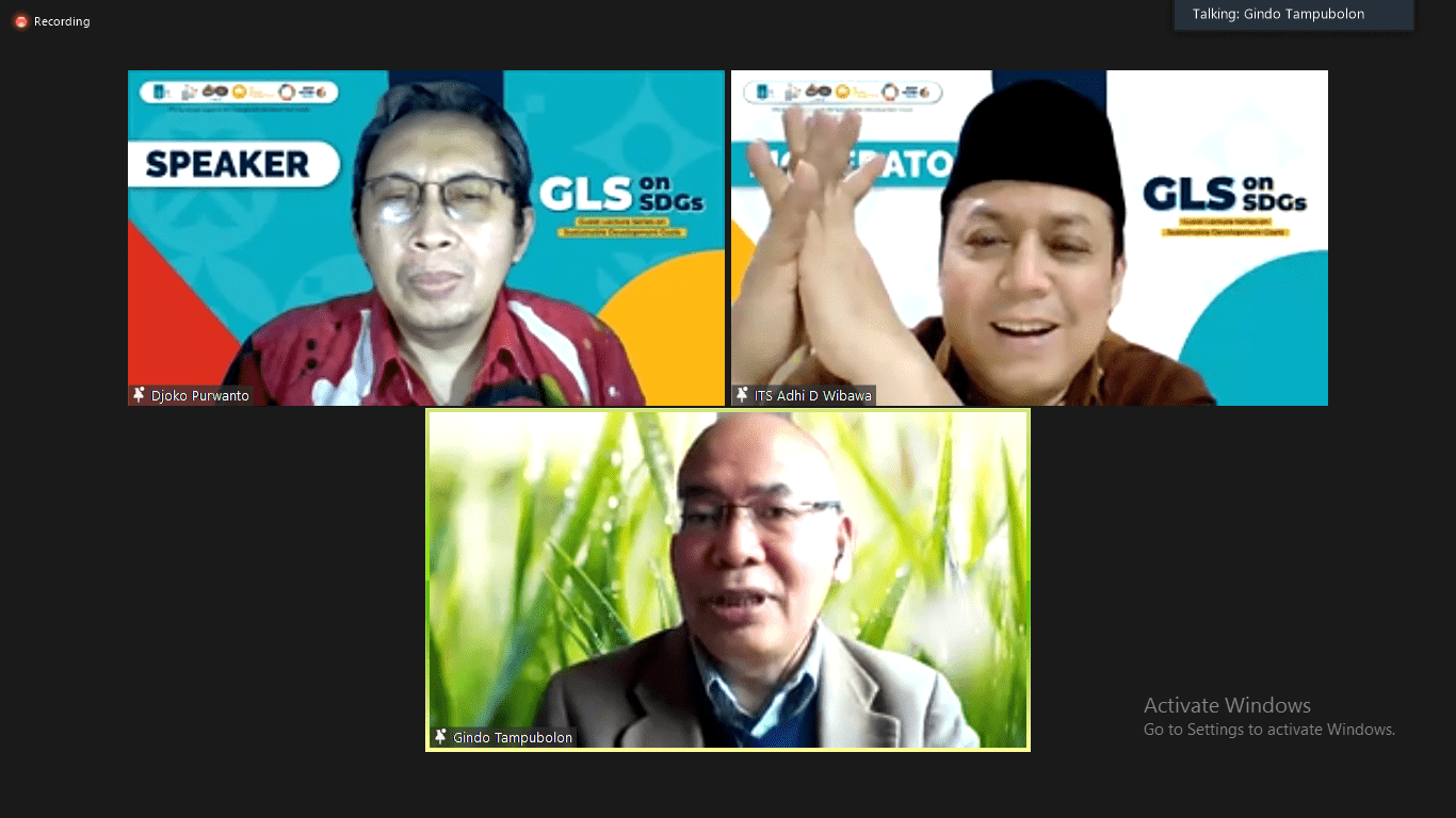 Dr Gindo Tampubolon dan Dr Ir Djoko Purwanto M Eng menjawab pertanyaan peserta dalam kegiatan Guest Lecture Series on SDGs.