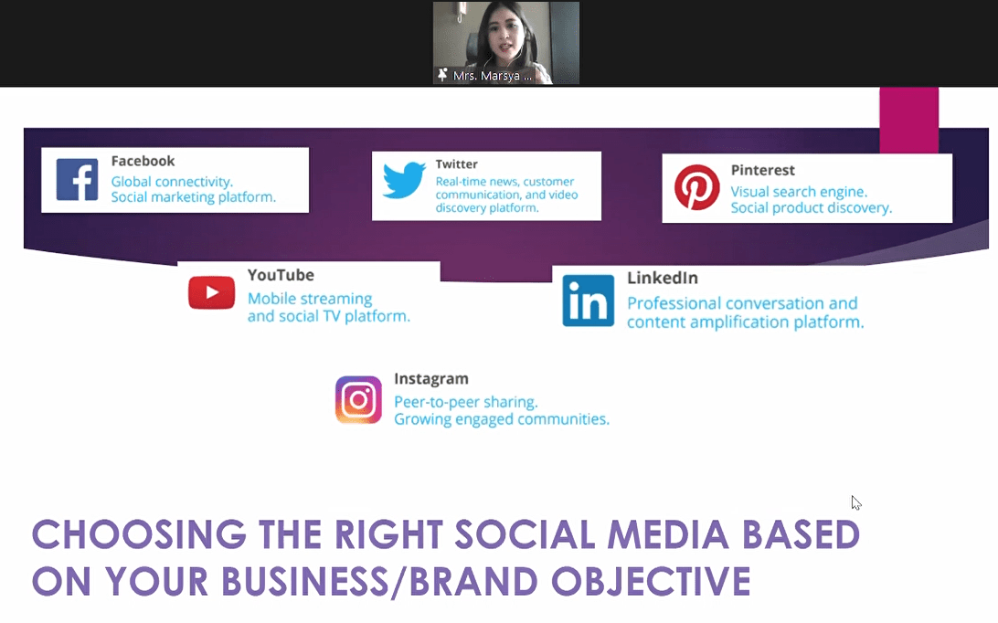 Marsya Gusman selaku pembicara, menyampaikan bahwa siapa saja dapat memulai bisnis. Bisnis bisa dimulai dari usaha kecil dan tidak harus bermodal besar. “Media sosial dapat menjadi pilihan utama sebagai plaftrom untuk memulai bisnis dengan resiko yang lebih kecil,” terangnya.