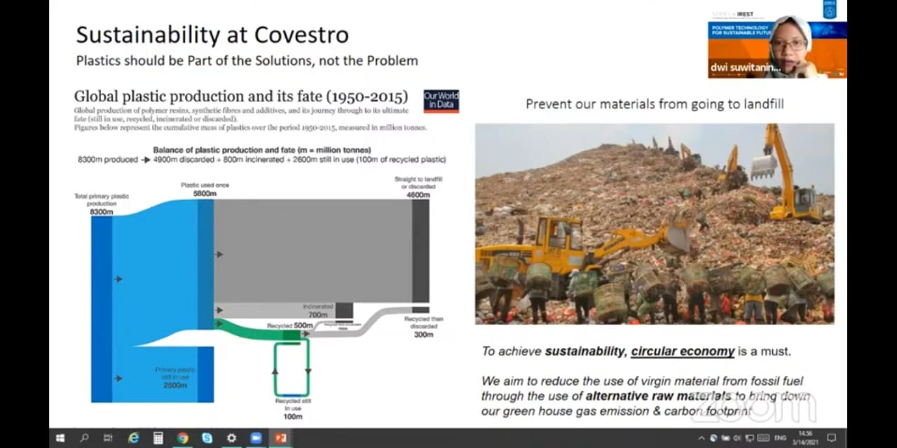 Selain plastik sebagai pengganti bahan bakar fosil, alumnus Teknik Kimia ITS itu menambahkan material alternatif lain yang saat ini telah digunakan oleh perusahaan tempat ia bekerja, Covestro, yaitu biomassa dari tumbuhan yang berguna untuk mengurangi penggunaan minyak. Selain itu, CO2 juga dapat digunakan kembali dengan cara polimerisasi. “Kita mencoba mengulik kembali limbah material menjadi raw material kembali,” tuturnya.