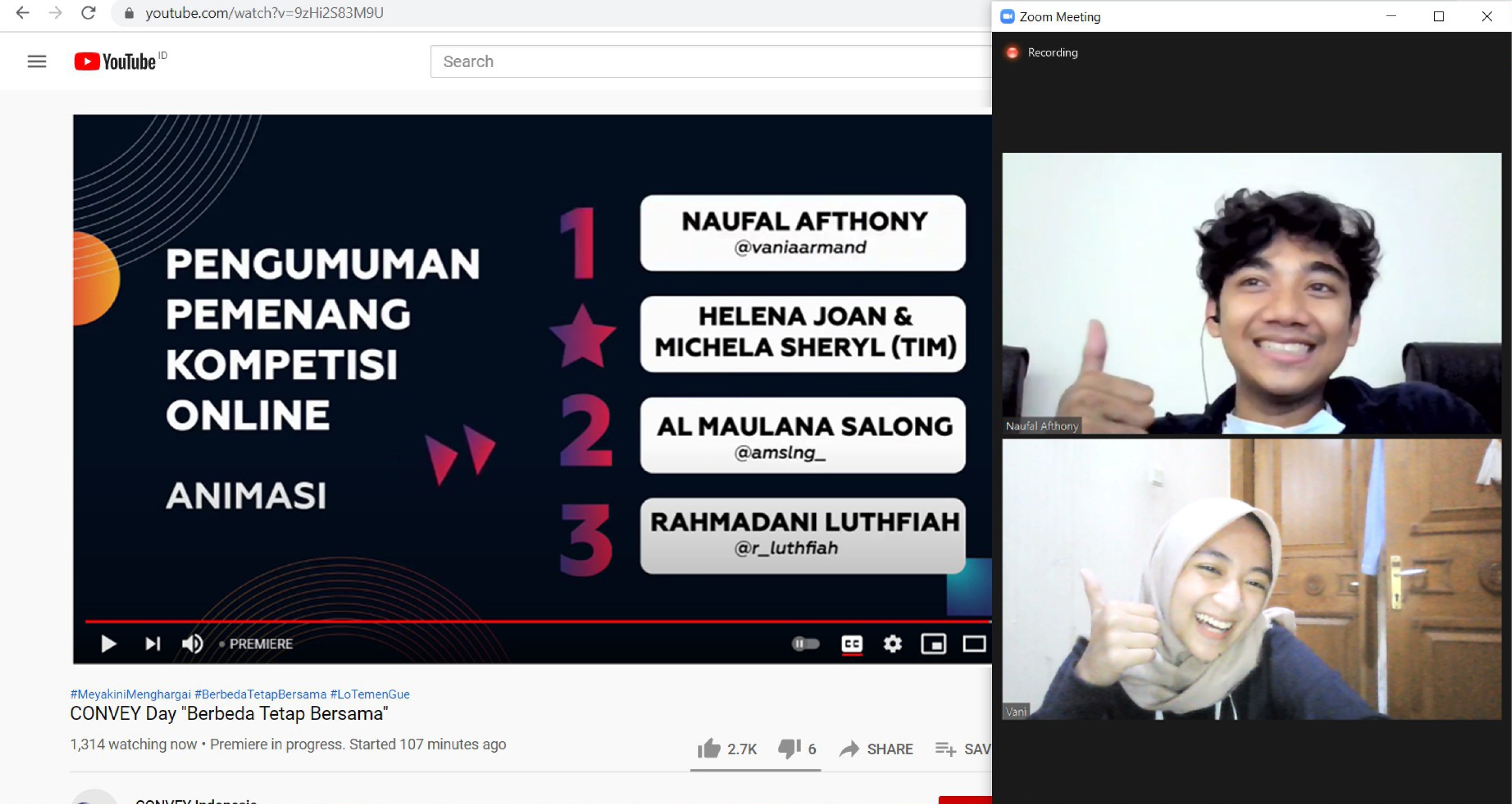 Naufal Afthony (atas) dan Arfita Vania Dewi (bawah) sedang melakukan foto bersama secara online saat pengumuman pemenang Kompetisi Online Animasi CONVEY DAY 2021